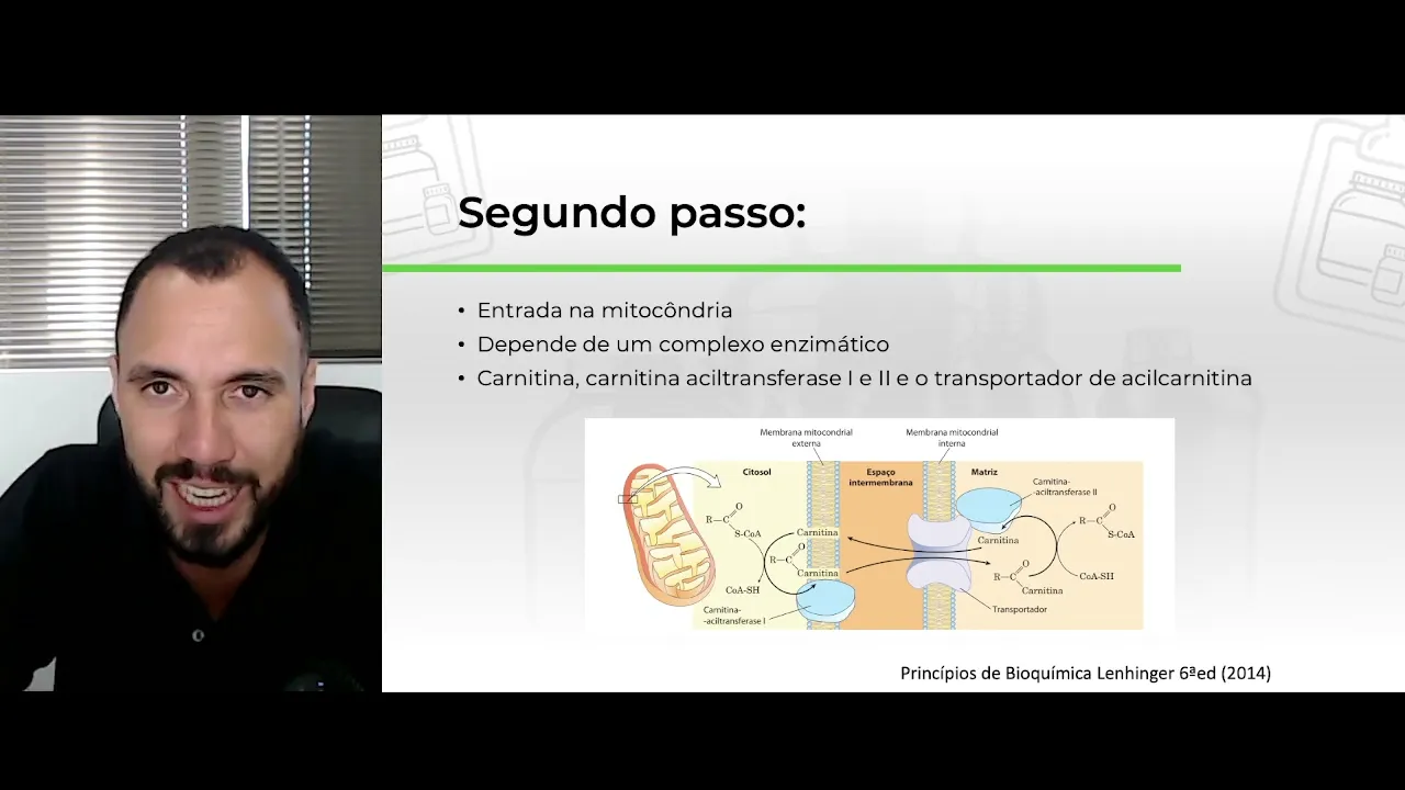 é o espaço interior da mitocôndria esse transporte Depende de um complexo chamado complexo carnitina que apresenta a molécula de carnitina essa daqui a carnitina aciltransferase um o transportador de Acil carnitina e a carnitina se transfer do a carnitina literalmente pega pelo braço da gordura e entra com ela na sua mitocôndria chega lá ela libera a gordura e fala vai gordura pode gerar pode ser oxidado dessa condição professor é daí que surgiu a ideia da suplementação da El carnitina é a gente vai falar sobre el carnitina então baseado no papel da carnitina como facilitador da queima