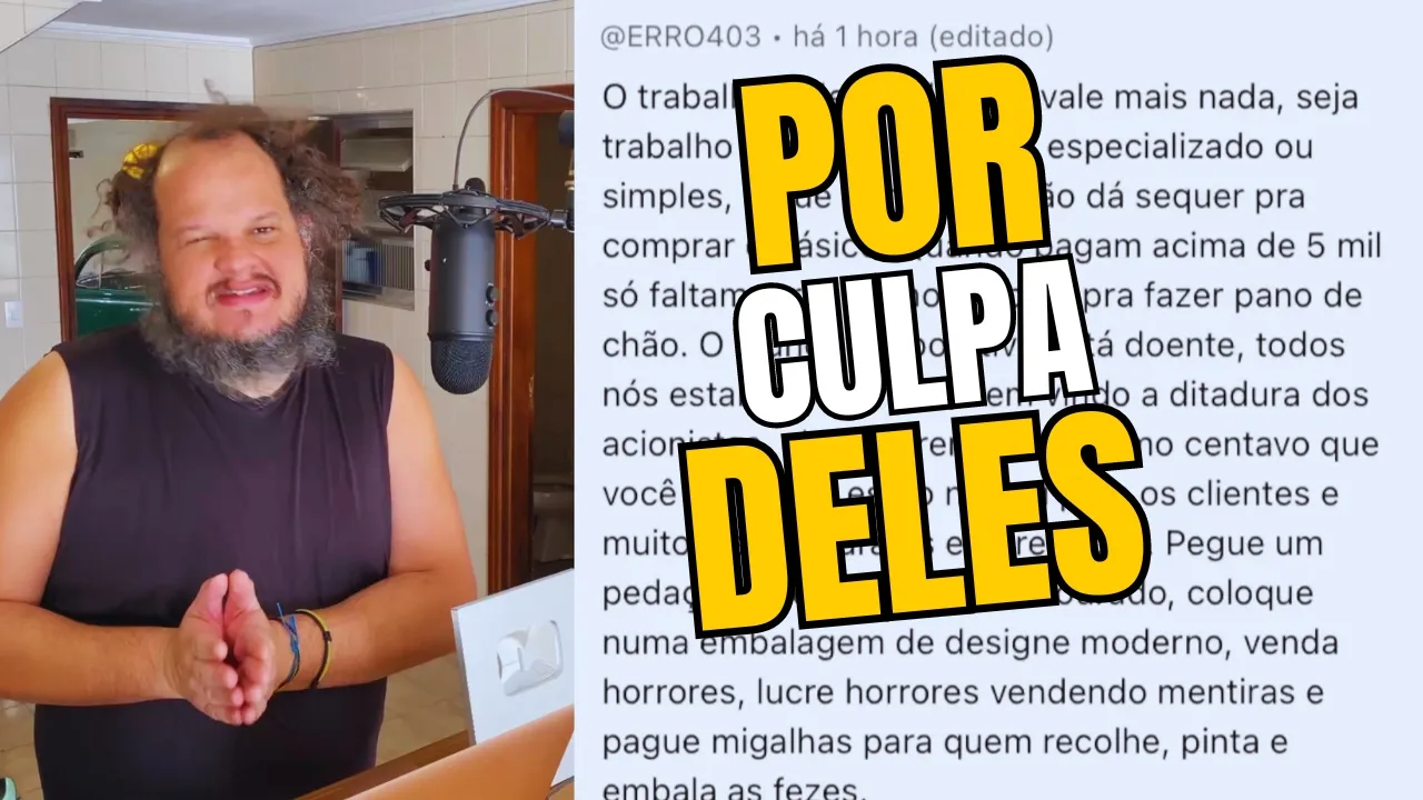000 é pouco acho que só a partir de 30. 000 que começa a ser uma coisa assim que já dá para você mais ou menos viver tá ligado um abraço aí pros políticos né que falam mais ou menos a mesma coisa e eu Antigamente eu não entendia isso aí depois eu comecei a entender que eu comecei a ver que é verdade né dinheiro não dá para nada velho você você ganha dinheiro e não tem dinheiro até porque é pouco dinheiro só is é muito da hora que você tiver dinheiro e tiver sobrando dinheiro né H então que ele tá falando aqui ó mundo corporativo tá doente né todos nós estamos doentes eu concordo com isso que você tá falando aí Porque de fato essa cultura que eu tanto critico aqui nessa cultura de você se colocar o trabalho no centro da vida tudo bem acaba acontecendo isso com a gente porque a gente vive para trabalhar basicamente principalmente você tem um trabalho presencial mora numa cidade igual São Paulo que é uma cidade que você só mora para mano fica pensando quem sã consciência né moraria em São Paulo por não ser questão de trabalho tem duas coisas né Às vezes eu trabalho né estudo também é trabalho não adianta fal ah trabalho eu estudo não você só estuda para trabalhar então é trabalho também é um trabalho não remunerado que às vezes você ainda paga por ele e a outra questão Às vezes alguma coisa assim de saúde que você só tem em São Paulo algum vínculo eh com família algumas coisas assim pode ser pode ser também mas eu duvido uma pessoa Imagina você mano você ganha na loteria que lugar do mundo você escolher para morar para morar em São Paulo tá ligado [ __ ] não dá né então infelizmente né a gente tem isso que essa cultura ela tá um pouco relacionada também com o consumo né que aí o meu calcanhar de Aquiles aqui é esse Eu tô louco para comprar um iPhone 16 aí eu tô pensando mano Por que que os cara faz o evento quando ainda não tem disponível alô alô é hein Vocês estão deixando dinheiro na mesa sabe por quê Se vocês fizessem esse evento e já tivesse um negócio para comprar Pronto já tinha comprado agora vocês fazem o evento aí só vai vai lançar daqui tantos dias até lá eu já mudei de ideia não compro mais então o consumismo né a gente pode dizer assim esses que no final das contas né mano eu acho que o não é um bem um problema né você querer consumir você sonhar e melhorar de vida fazer outras coisas acho que isso é o natural O estranho é quando você não quer mais isso né inclusive pessoas têm problemas emocionais como depressão por exemplo ela deixa de sonhar ela deixa de querer as coisas né então tem esse lado que fica impulsionando a gente para pessoal do lado corporativo aí e aí a gente fica nessa vida que gira em torno do trabalho né a gente dá para perceber dá mas a gente não consegue eu pelo menos eu percebo o quanto que você comprar coisas com dinheiro de trabalho enquanto você tá trabalhando não adianta muita coisa porque você não tem tempo de usar eu entendo isso racionalmente agora transformar isso em em prática é outra coisa n igual aqui eu sei como ficar rico é só trabalhar muito não gastar e esperar o tempo passar lá investindo Beleza tô rico não preciso mais trabalhar como emagrecer a mesma coisa só comer pouco Fazer mais exercício e esperar o tempo passar então eu sei como fazer mas fazer eu não consigo fazer qual que é esse esse pulo que precisa dar né entre o conhecimento e a prática das coisas né E nessa vida corporativa a gente tem isso a gente tem toda uma cultura bem profunda construída ao redor dessa ideia de que todo mundo tem que trabalhar de que o trabalho é o centro da vida que se vive para trabalhar que é o propósito de que a sua identidade é a sua profissão né Então tudo isso bebe dessa fonte aí né Aí ele tá falando aqui ó bem-vinda à ditadura dos acionistas né eles querem até o último centavo que você gera não estão nem aí para os clientes e muito menos para os empregados é isso eu não sei né não sei até que ponto você cacion será que não é culpa do governo não e o governo fica lá pegando que nem você falou aí para ganhar 5. 000 é difícil né a pessoa que ganha na na carteira ali o bruto ela já custa pra empresa 5.