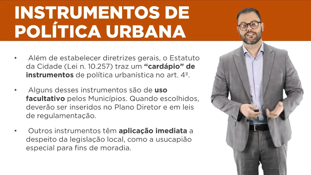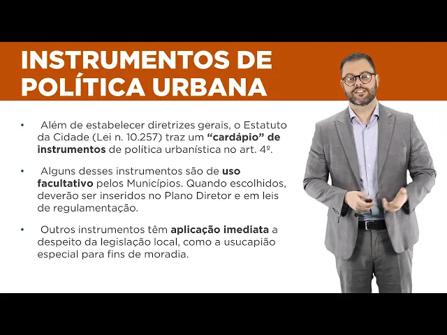 E aí pessoal tudo bem dando sequência ao nosso curso de Direito urbanístico Nesta aula eu gostaria de tratar dos instrumentos de política Urbana meu intuito aqui é apresentar um Panorama desses vários instrumentos fazendo uma introdução para aulas posteriores nas quais eu comentarei esses instrumentos especificamente vamos lembrar que o estatuto da cidade a lei 10.257 2001 além de tratar do plano diretor além de trazer diretrizes de desenvolvimento urbano e falar de gestão democrática da cidade traz um cardápio de instrumentos jurídicos para o desenvolvimento urbano eu gosto de utilizar essa palavra cardápio entre aspas para indicar que