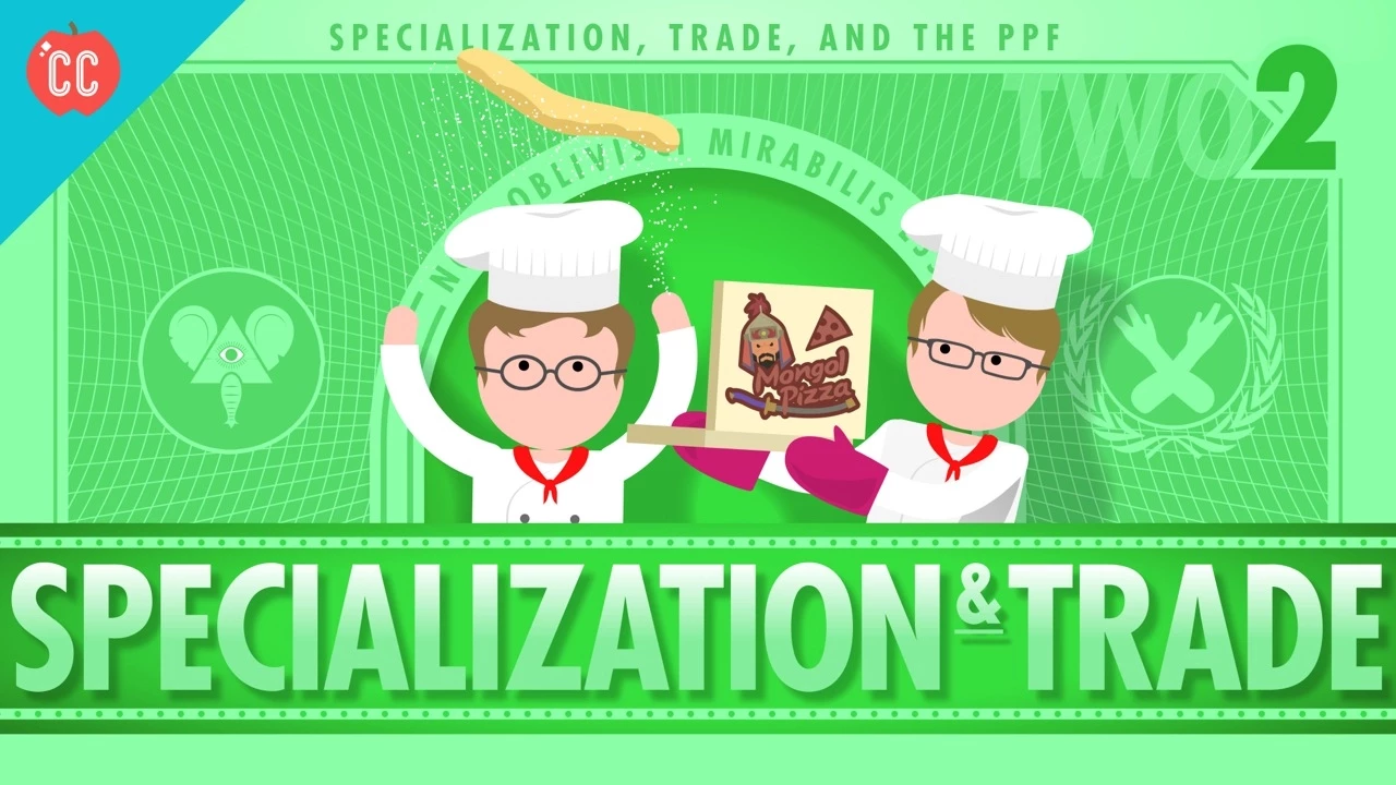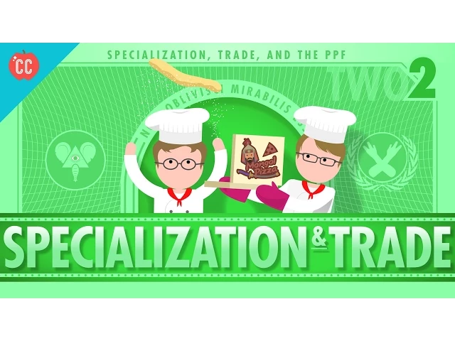 Adriene: When I think of specialization, I think of a pizza restaurant where different workers have specific tasks like preparing the ingredients, making the pizza, putting it in the oven, taking it out and putting it in the box. This division of labor makes each worker more productive since they can each focus on the thing they do best, and they don't waste time switching between jobs. But specialization goes beyond the assembly line for pizza.