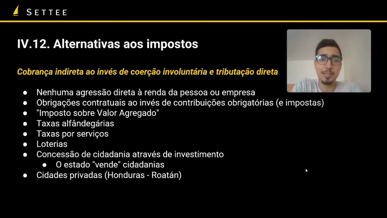 diretos não tem imposto de renda seja para pessoa seja para empresas as pessoas às vezes ficam se perguntando Tá mas e aí como é que vai ter na educação saúde como que vai ter os bens públicos de governo etc e aqui a gente pode pensar em alternativas foi um Capítulo inteiro falando de impostos agora a gente vai sobre que formas que os governos poderiam financiar sem impostos como que a gente poderia ter serviços na verdade de governança sem impostos então a ideia a gente não tem nenhuma agressão direta a renda da pessoa porque afinal o
