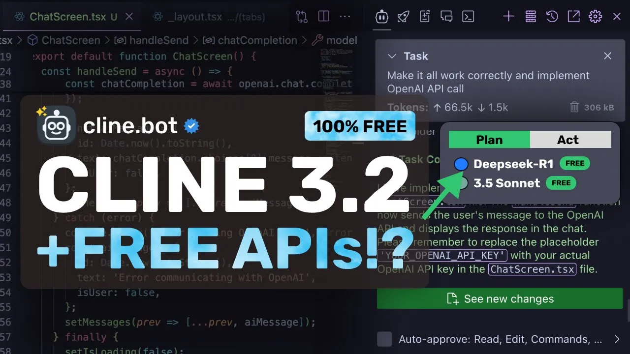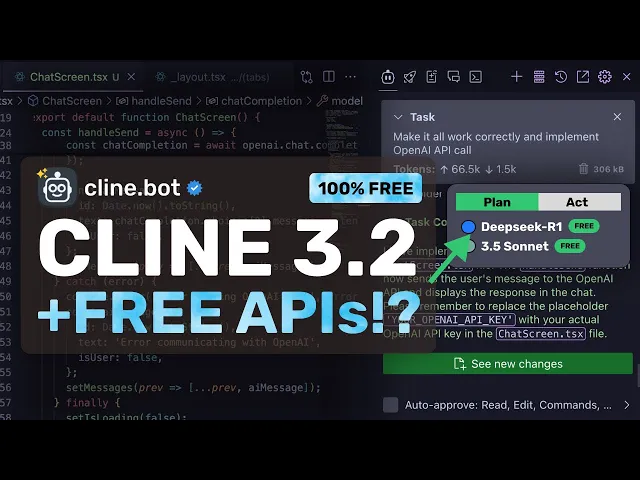 put in the API key here so this is great if you want to use deep seek R1 for free as well now let me also show you how you can use all these new features first let's go over here now here we can just select the plan option also I'll keep deep seek R1 here now we can just ask it to make a plan I have an expo app here I'm going to ask it to make me a chat interface that uses the open AI SDK and make it goodlooking once we send it you can
