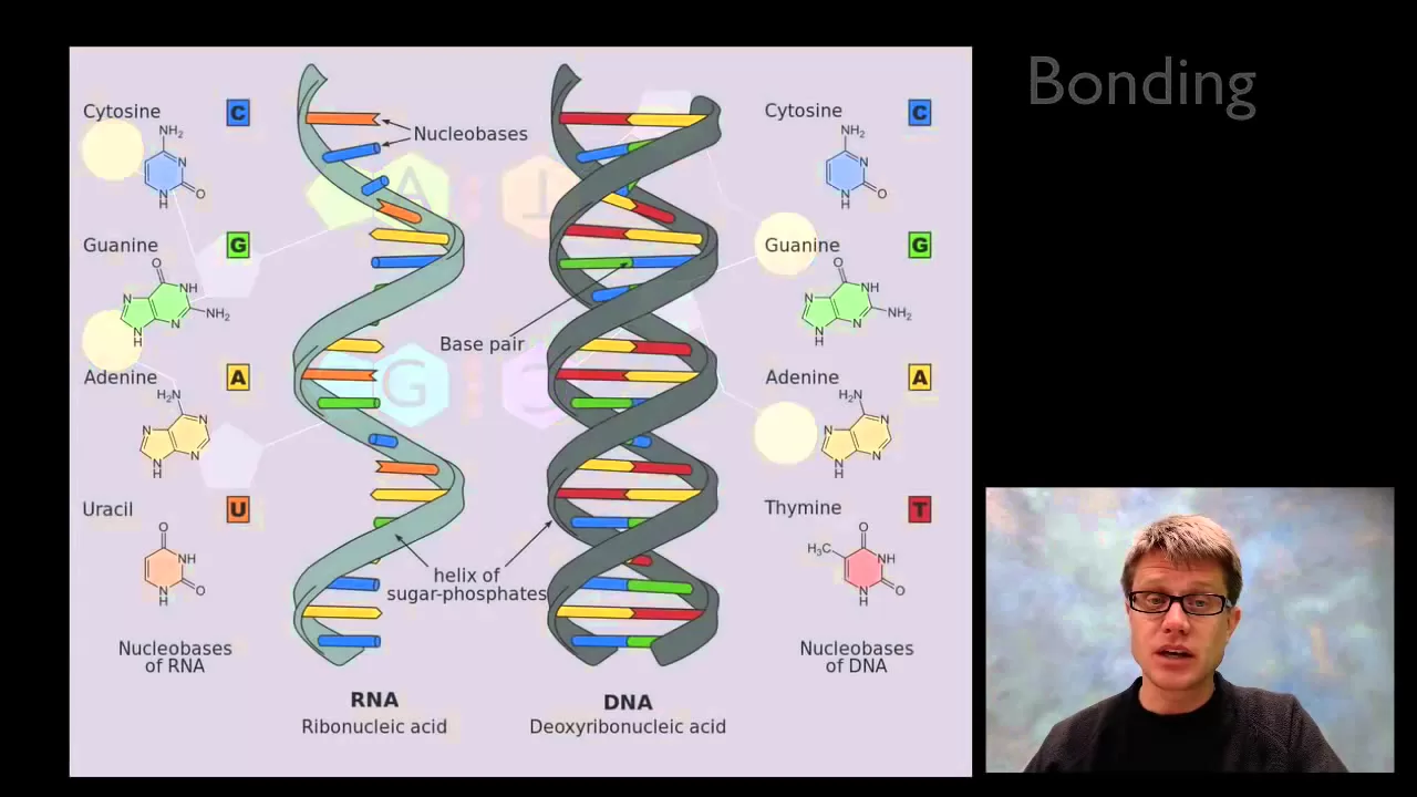 here well basically I can turn it upside down down and it's going to form hydrogen bonds here between the adenine and thymine and you've probably heard this before that adenine will always Bond uh to thyine and guanine will always bond to cytosine and that's why there's going to be interactions between the oxygen nitrogen and the hydrogen and make these hydrogen bonds that are con connect the two and so when you're looking at DNA let's kind of switch to this next slide when you're looking at DNA that's what's being connected right here in the middle so