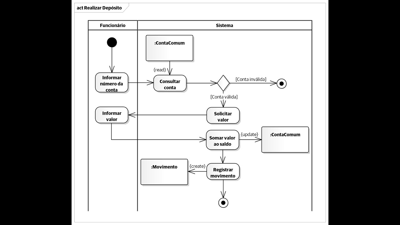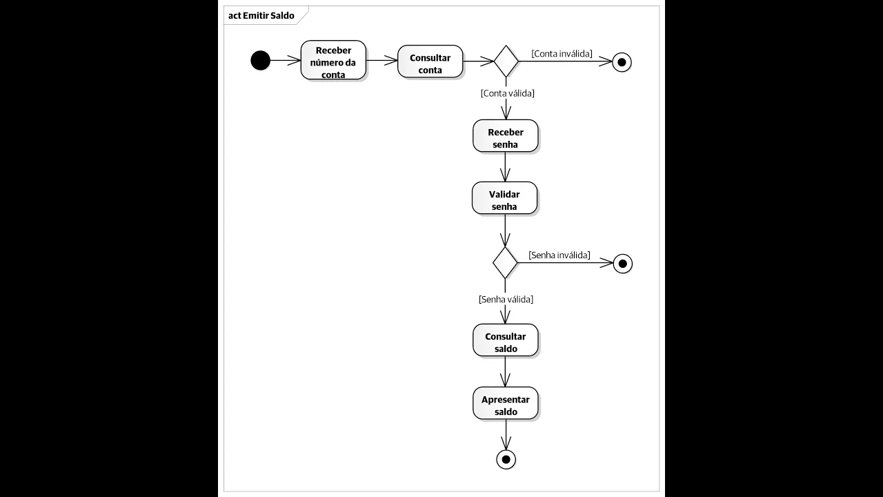 atividade de emissão de saldo do Sistema de Controle bancário que nós estamos modelando ao longo dessas aulas então o processo se inicia com o recebimento do número da conta depois se passa para a ação de consultar conta em seguida Como já foi explicado anteriormente se decide se o processo vai ser encerrado caso a conta seja inválida ou se se a conta for válida se recebe a senha depois se valida a senha se passa a um novo nó de decisão onde se decide se o processo será encerrado caso a conta a senha seja inválida ou se