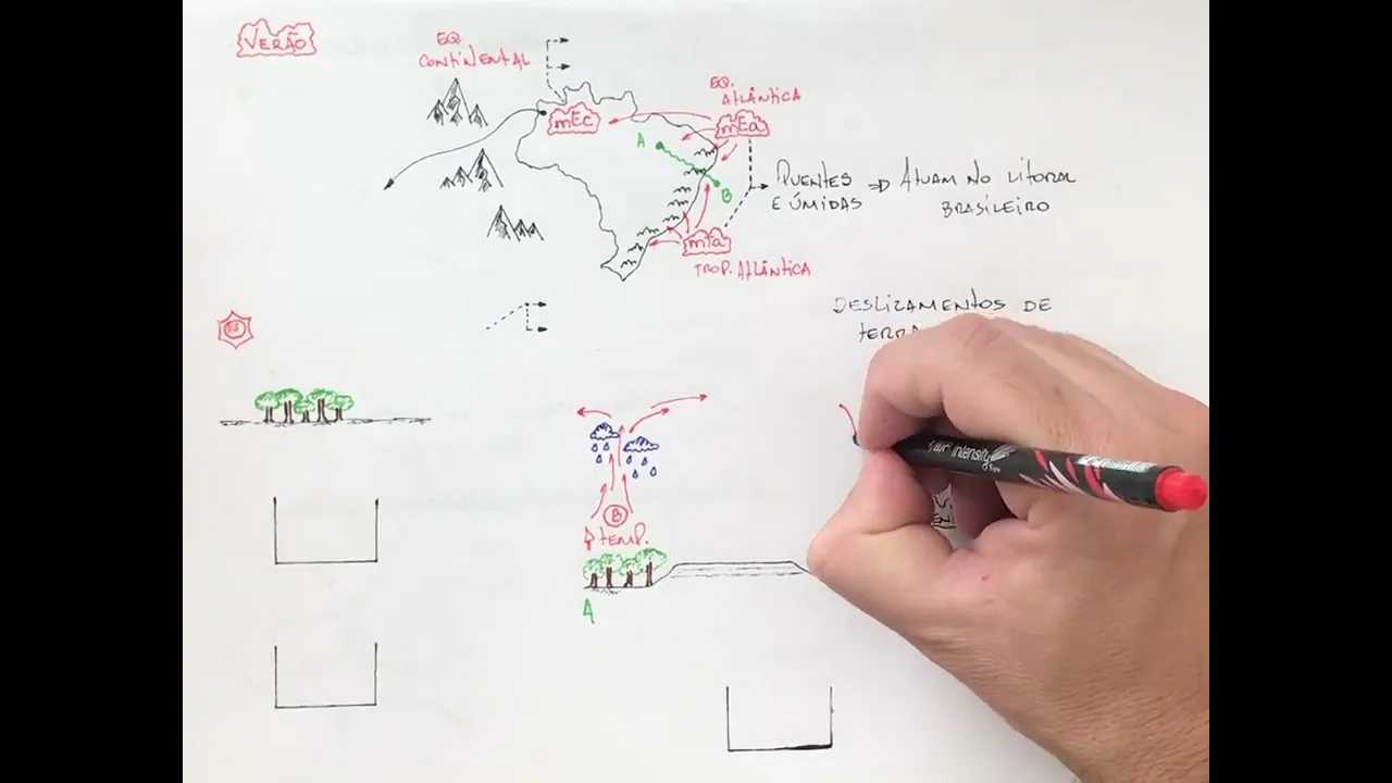 Fala minha gente vamos estudar agora a atuação das massas de ar no Verão Brasileiro as três principais delas que são a massa Tropical Atlântica então massa tropical Atlântica a massa Equatorial Atlântica e a massa Equatorial Continental Essas são as três massas de ar cuja atuação priorizam no Verão Brasileiro a gente nunca pode esquecer que são três massas de ar predominantes no verão no Brasil nós temos cinco massas de ar ainda tem massa Tropical Continental que se forma na região do Paraguai e temos a massa polar Atlântica que se forma no Polo Sul e atravessa a
