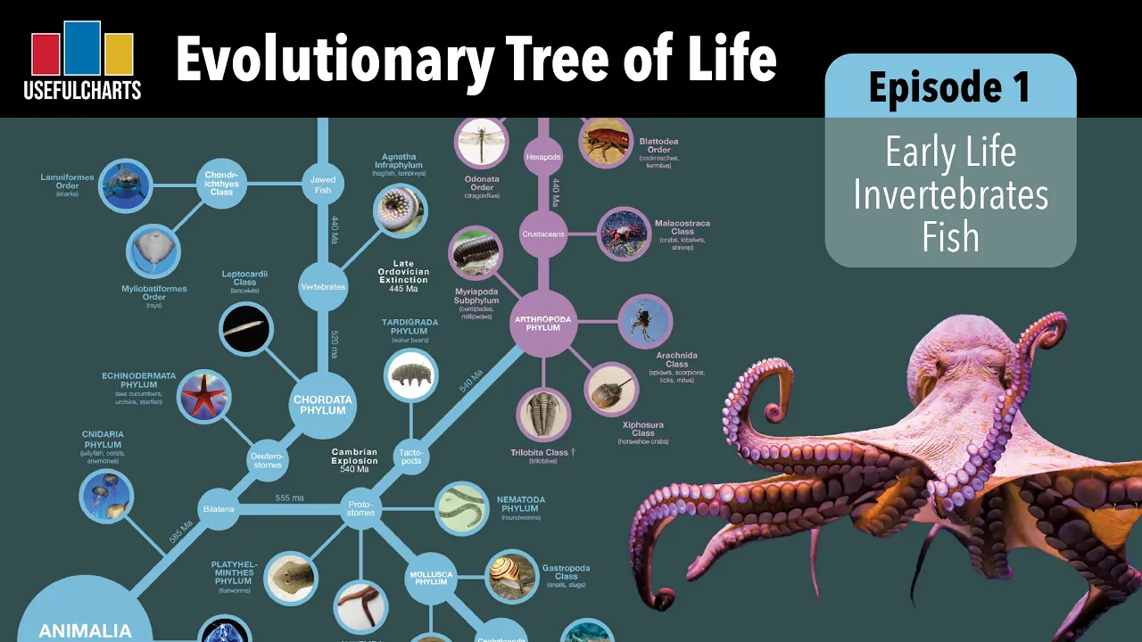 Okay, so today’s video is going to be the first in a series of videos that I'll be doing on evolution, mostly explaining the Tree of Life chart in detail. In Episode 1, I'll be focusing on the very earliest forms of life and how they ended up leading to the three major kingdoms that most people are familiar with: Plants, Fungi, and Animals. From there, I’ll be going through invertebrates, such as Molluscs and Insects, as well as the earliest type of vertebrates: fish.