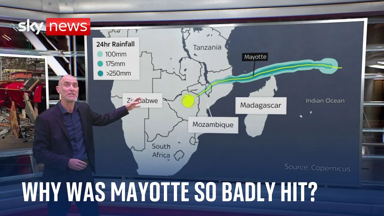 the track of cyclone Cheeto over the Indian Ocean sent it directly across the tiny islands of mayot as well as catastrophic Winds of more than 130 mph it bought intense rain shown by these bands with over 25 cmers causing flash flooding and landslides too seen from space you can see how mayot took the full force of the compact storm with no large land mass to dissipate it which is only now happening as the Cyclone meets the African continent it's the worst storm in 990 years to hit the islands a tiny French territory north of Madagascar