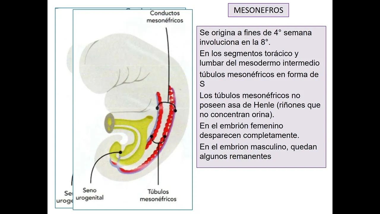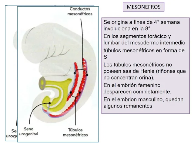 es el mes onefros Sí el mesone Frost comienza a formarse fines de cuarta semana principios de quinta semana y como dijimos previamente lo hacen por inducción de El pronefros sí a nivel del mesone Frost vamos a tener una serie de túbulos que vamos a llamar tubulos mesonéfricos y fíjense que acompañando a lo largo a todos los túbulos mesonéfricos tenemos el conducto mesonefrico de Wolf estos túbulos mesonefricos adquieren forma de s y como característica importante es que estos túbulos no poseen Asa de henle por lo tanto estos estos riñones son incapaces de concentrar orina los túbulos