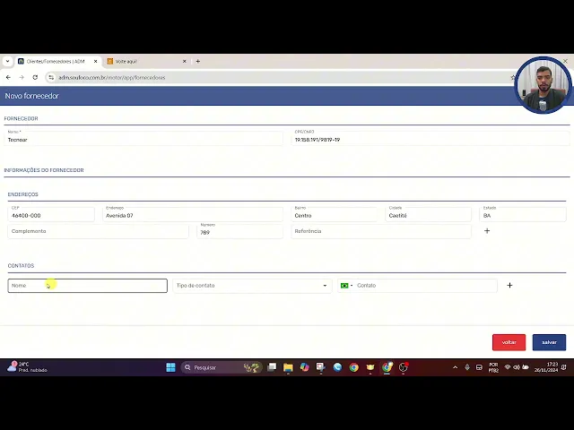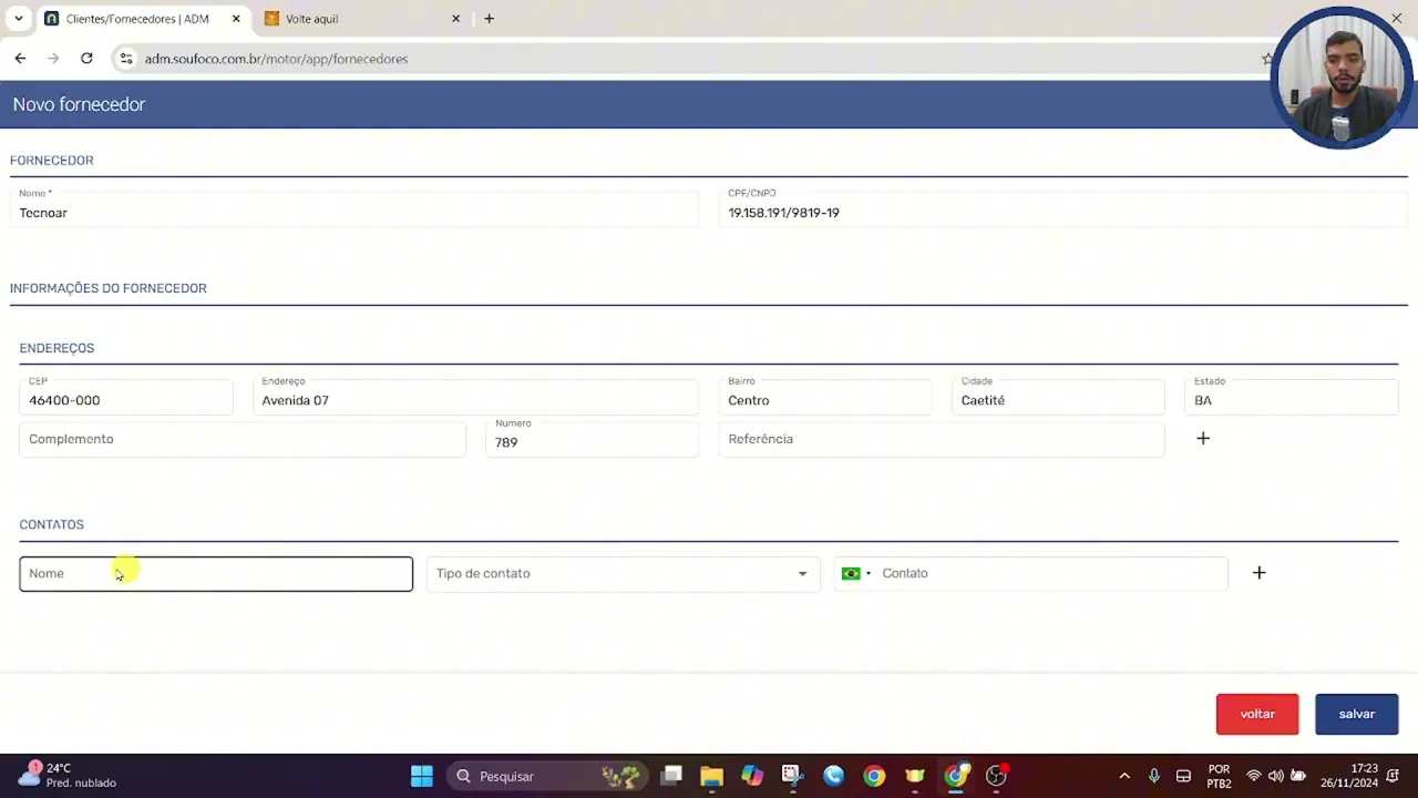 Olá me chamo o Globo e sou agente de treinamentos seja bem-vindo ao tópico fornecedores para acessar esse tópico clique em ADM e fornecedores nesse tópico cadastrarem os fornecedores de produtos ou serviços e também os fornecedores aqui cadastrados podem ser espelhados em outros tópicos do sistema vou cadastrar aqui um fornecedor de ar condicionado em um cenário Digamos que no estabelecimento solicitamos a compra de alguns ar condicionados Então vamos inserir aqui o nome da loja será a tecno a vamos incluir aqui o CNPJ fornecedor e também podemos inserir informações como endereço e contatos inserir aqui um endereço