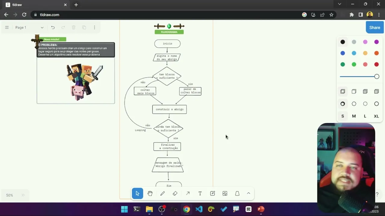 agora vamos imaginar que né durante esse processo aqui depois que finalizou você quer que apareça uma mensagem imagina que você tá programando ali num jogo você quer que apareça uma mensagem na tela né tipo abrigo construído como é que você faz isso você vai representar aqui ó com essa caixinha que parece um monitor Tá vendo você vai colocar aqui ó mensagem né eu vou colocar aqui ó vai aparecer uma mensagem mensagem de saída tá abrigo finalizado tá então isso aqui é uma mensagem de saída vai aparecer uma mensagem na tela depois aqui ao final disso