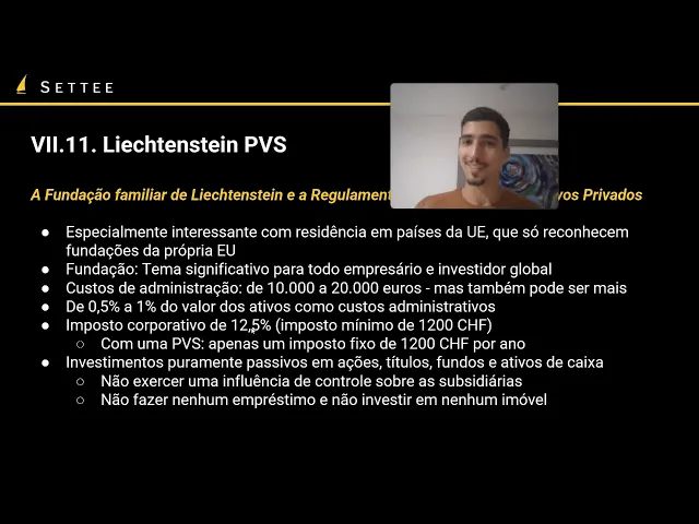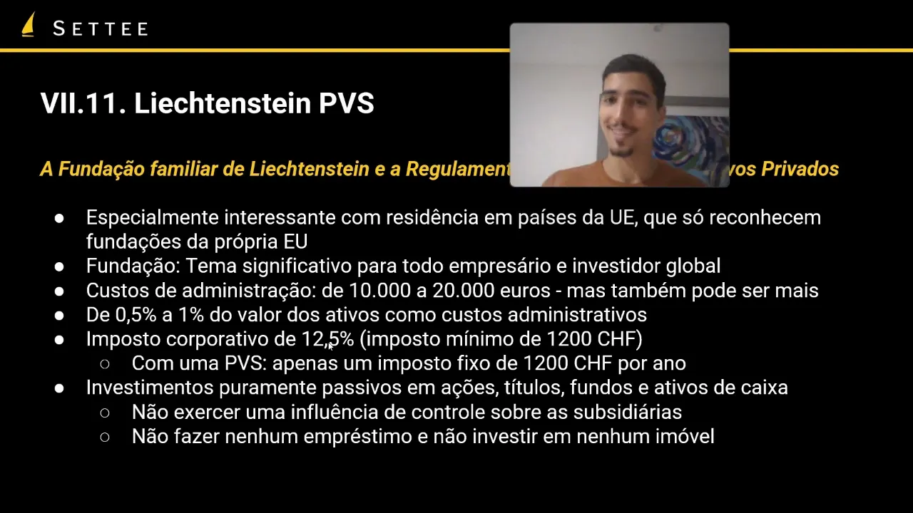 sejam muito bem vindos a nossa última aula do capítulo número 7 do nosso curso de teoria das Bandeiras em que vamos falar sobre estruturas para holdings especificamente Luxemburgo e também outras jurisições interessantes para isso começando com Luxemburgo um país que recebe muito interesse da gente aqui na Sat muitas pessoas perguntam né quais as opções e Luxemburgo e as empresas padrão assim Luxemburgo as nossas são exatamente livro de impostos né Você tem um imposto corporativo significativo em Luxemburgo porém a gente tem uma estrutura que é particularmente interessante que é a STF se você tem Legends patrimônio familiar eu não falo francês mas essa estrutura aqui que apesar de no nome falar que é uma estrutura de gestão de patrimônio familiar não tem restrição a membro da família pode ser feita com sócios que não são parentes não tem nenhuma restrição estrutura que é puramente da área de gestão de ativos de holding pura ela não pode se envolver em nenhuma outra atividade comercial não pode prestar serviços não pode vender produtos etc o objetivo exclusivo dessa estrutura é a aquisição pós sugestão e execução de transações financeiras e de ativos patrimônio adquirir administrar fazer transações tudo mais mas ela não pode prestar Nenhum serviço diretamente e essa empresa ela pode fazer trade em ativo essa é uma questão que vale mencionar não é ela mas estrutura digamos passiva ela não pode interferir na gestão de uma empresa subsidiária ela pode investir mas não pode ativamente estar falando como que as coisas devem ser geridas mas ela pode fazer trade em ativo Então se quiser ficar fazendo várias operações financeiras o tempo todo a empresa não pode ter propriedades Imobiliária direta tá então ela não pode ter um imóvel mas ela pode ter por exemplo ações em um Hit em um fundo imobiliário os acionistas podem ser tanto pessoas físicas quanto empresas Ou intermediários fiduciários que atuam no interesse da riqueza privada de pessoas físicas e essa empresa ela é bem única certa forma dentro da União Europeia né uma empresa dentro da União Europeia que tem uma completa isenção de Imposto de Renda corporativo patrimonial etc ela tem apenas um imposto de inscrição sobre patrimônio de 0,25% por ano o que significa é 0,25% por ano do patrimônio administrado tá então digamos se você tem 100 mil euros de patrimônio administrado um por cento disso seria euros 0,25 0,25% disso seria 250 euros e seria o imposto que você teria sobre um patrimônio gerido de 100. 000 euros então basicamente com tanto que você consiga performar acima disso portanto que você consiga com seus investimentos com essa gestão de ativos ter mais do que 0,25% de crescimento patrimonial a empresa acaba valendo a pena financeiramente tá uma desvantagem da SPF que ela não consegue utilizar os acordos de nome tributação de Luxemburgo Essa é um desvantagem relativamente significativa para aqueles que querem por exemplo que estavam pensando em utilizar ela para investir por exemplo no mercado americano o custo anual de uma SPF no primeiro ano vai sair quase na casa dos 10 mil dólares e a partir do segundo ano na casa dos 7 mil dólares então é uma entidade relativamente cara de estabelecer geralmente faz sentido como uma holding principal de várias sub-roadings europeias etc no caso também não há nenhum imposto eu tive uma fonte sobre os dividendos tá então isso eles realmente é o único imposto que teria é esse imposto de inscrição que tem um limite máximo de 125 mil Euros por ano então se você tem um patrimônio sabe ele tá falando de um fundo diga bilionário milionário enfim você ainda tem um imposto máximo de 125 mil euros esses 0,25 além disso a gente tem a pvs de Listen steinstein de forma geral é uma jurisdição extremamente estável não está dentro da União Europeia Mas está dentro da Europa né tem acesso tem acordo de nome tributação com vários países europeus Suíça também eles têm o franco suíço como moeda oficial é um país uma regulação muito amigável à cripto muito amigável com proteção patrimonial é um dos pouquíssimos países do mundo que tem mais reservas do que dívidas enfim está em um país muito estável seguro e é protegido pela Suíça no caso a fundação familiar é uma estrutura interessante mas a gente não vai abordar ela aqui porque ela geralmente mais interessante só para quem mora na Alemanha ao etc para quem mora fora acabam tendo opções mais interessantes mas tem essa regulação de estrutura de proteção estrutura de ativos privados que é pvs basicamente quando que Listen Stein pode fazer sentido se você mora em países da União Europeia de forma geral eu acabei de mencionar os países de língua alemã mas também em outros países da União Europeia que só reconhecem Fundações da própria União Europeia né então tem vários países lá que não reconhecem Fundações panamenhas por exemplo mas reconhecem uma Fundação que normalmente na União Europeia mas espaço como europeu ainda é reconhecido inclusive Fundações são tema de altíssimo interesse para todo empresário investidor Global né é uma estrutura que junto com os trushs e associações cooperativas pode alcançar um nível de proteção patrimonial muito elevado porém se você tá fora da União Europeia geralmente uma Fundação panamenha ou em outros países pode fazer mais sentido do que está indevido ao seu custo relativamente elevado que vai ficar aí na casa dos 10 a 20 mil Euros por mas também vai ter o custo além desse discurso aí geralmente vai ficar na casa de Meio a Um por cento dos do valor dos ativos como curso administrativo Então você tem que conseguir performar acima disso né para fazer valer a pena também mas o custo mínimo vai sair na casa dos 10 a 20 minutos há um imposto corporativo de 12. 5 que exclui não inclui ganho de capital e