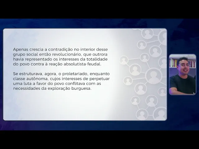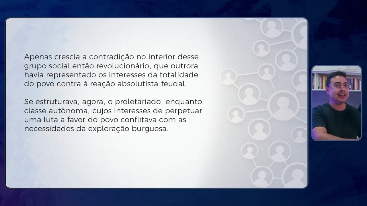 reis absolutistas né que é a monarquia que imperava ali nós tínhamos o clero que também tinha muito poder naquele momento para romper com esse processo absolutista feudal surge esse grupo social a burguesia que naquele momento é sim revolucionária É sim Progressista eles têm o progresso como ponto aí de pauta né eles querem o progresso querem diminuir os problemas dos seres humanos eles querem e acabar com o problema do proletariado representa os interesses do Povo naquele momento sim parecia que ia nessa direção só que se estruturava agora o proletariado Depois dessa revolução enquanto classe autônoma cujos