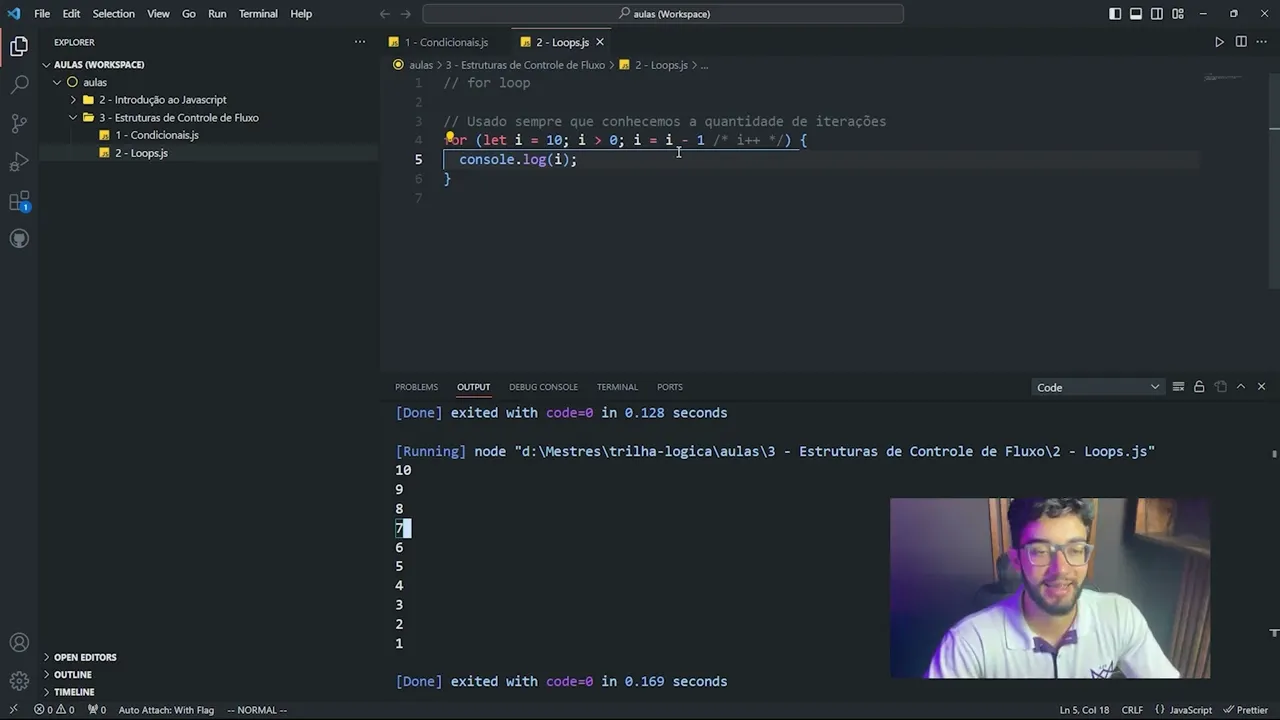 n não printa nada no console porque ele não chegou a entrar aqui dentro do bloco de código porque ele foi barrado né antes pela condição então é uma diferença bem Sutil só que quando nós estamos né no no ambiente real eh essas diferenças podem nos ajudar muito tá para para basicamente decidir ou não se eu vou executar ou não Ou continuar ou não naquele loop ou o código que está dentro do loop tá isso é muito importante então para essa aula aqui é isso tá Esses são os Loops que nós temos aí for loop Wi