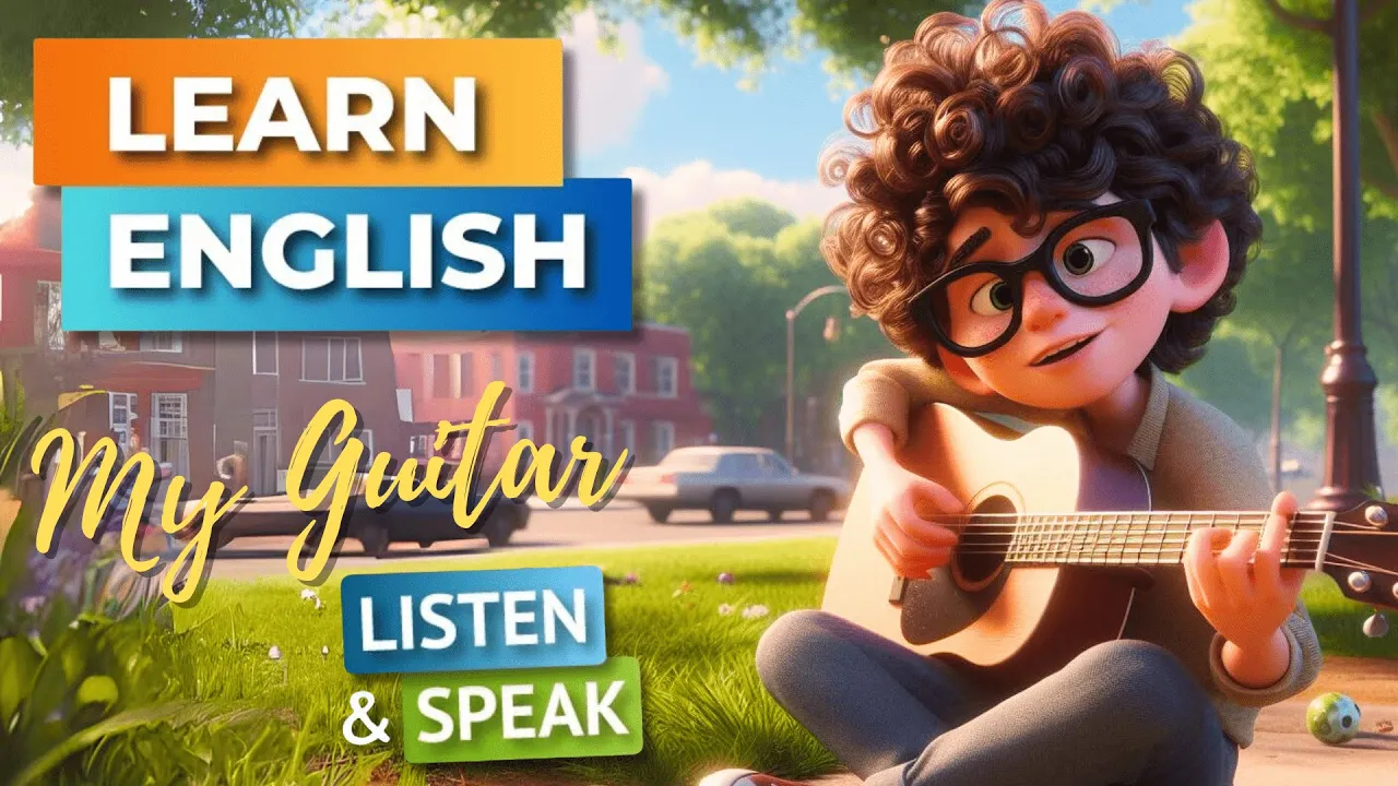 hi everyone in today's video max will tell you a story about his favorite guitar you'll learn some useful vocabulary and expressions that are commonly used in everyday conversations this will also be a great opportunity for you to practice and improve your English listening and speaking skills listen carefully hi I'm Mark let me tell you about my fantastic classical guitar and the fun we have espe especially at school I received my classical guitar on my 8th birthday and I named it Melody it's a beautiful instrument with a wooden body that gleams under the sunlight from the