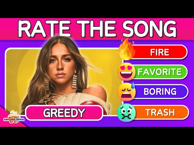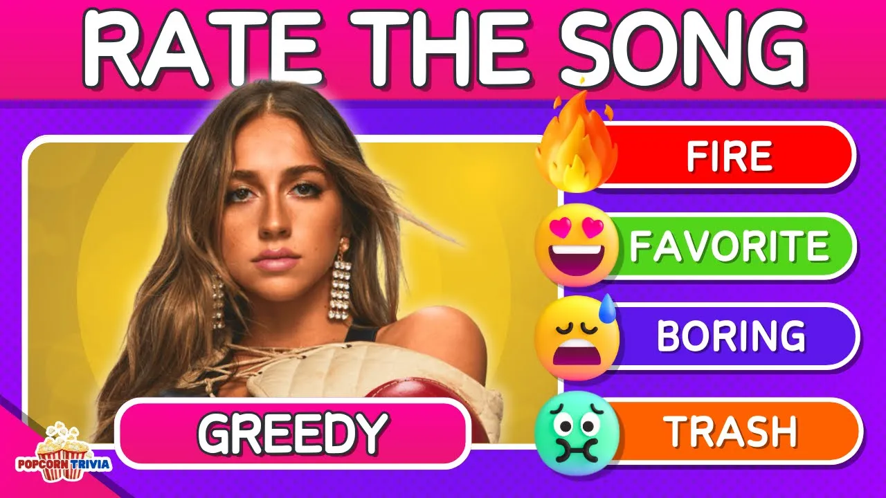 Hello friends are you ready to rank from fire to trash the most popular hit songs in this fun tier list game you decide whether they should be kept or forgotten but first please subscribe to the channel and hit the like button now grab your headphones turn up the volume and let's get to the video how do you rate this song greedy by Tate McRae is it fire favorite listenable boring or trash [Music] how do you rate this song yes and by Ariana Grant is this fire or [Music] trash how do you rate this song eyes
