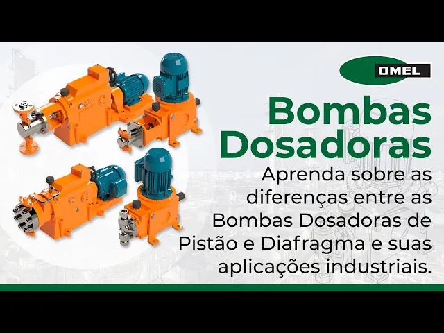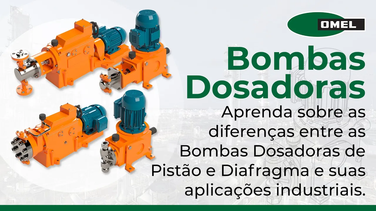 Olá seja muito bem-vindo ao mel e no vídeo de hoje vamos falar sobre as bombas dosadoras mais precisamente sobre as bombas dosadoras de diafragmas e as bombas dosadoras de pistão vamos abordar o que são como funcionam e quais as principais vantagens e desvantagens de cada uma delas e por fim vamos falar sobre as aplicações e os principais tipos de bombas dosadoras fabricadas pelo Mel Vale ressaltar que nós somos uma empresa genuinamente brasileira com Engenharia e assistência técnica própria a sua inteira disposição O que é uma bomba dosadora uma bomba dosadora é um equipamento de precisão utilizado sempre que é necessário bombear quantidades exatas de um fluido num determinado processo com volume e tempos definidos também é conhecido como bomba de volume com controlado pode ser usada aém de bomba como um medidor de vazão e ou elemento de controle resolvendo uma enorme variedade de problemas no campo do processamento químico elas podem ser controladas de forma elétrica ou pneumática por meio de instrumentos remotos ou automáticos de Controle de Processo oferecendo portanto uma maior linearidade precisão e faixa de aplicação quando comparado às válvulas de controle convencionais aqui na omel nós trabalhamos com dois tipos de bombas dosadoras As bombas dosadoras de pistão e as bombas dosadoras de diafragmas vejamos a seguir as principais características de cada uma delas e vamos conhecer agora o funcionamento da bomba dosadora de pistão trata-se de uma bomba de deslocamento positivo com movimento alternativo ela possui um sistema mecânico que transforma o movimento rotativo em um movimento alternativo no nosso caso temos um eixo acionado pelo motor que pode ser elétrico pneumático ou hidráulico acoplado ao parafuso Sem Fim o parafuso Sem Fim por sua vez aciona a coroa que terá uma rotação mais baixa acoplado à coroa nós temos a biela que é o componente mecânico responsável pela conversão do movimento rotativo da coroa em um movimento alternativo do pistão Vale ressaltar também o mecanismo de ajuste da vazão bombeada composta pelo volante e esse mecanismo aqui central com a rotação do volante esse mecanismo irá mais à direita ou mais à esquerda permitindo assim um movimento maior ou menor do pistão a bomba possui uma câmera de líquido móvel que expande ou contrai de acordo com o movimento do pistão no nosso exemplo quando o pistão vai para a esquerda nós temos um aumento da Câmara por outro lado quando o pistão vai para a direita nós temos uma ução desta Câmara existe um princípio termodinâmico que mostra que a expansão de um determinado volume provoca a queda da pressão por outro lado a redução de volume provoca um aumento de pressão o fluxo da bomba é controlado pelas válvulas de retenção dis sucção e de descarga cada válvula é composta por uma assento uma esfera e um anteparo limitador de movimento da esfera quando a câmera ela expande a pressão na câmera cai isso faz com que a pressão na câmera seja menor que na sucção fora da bomba e na descarga a pressão na descarga estando maior empurrará a esfera contra o acento promovendo a vedação da válvula de retenção de descarga por outro lado estando a pressão na linha de sucção mais alta do que a pressão interna da bomba fará com que a esfera seja empurrada para cima afastando-a do assento permitindo assim a movimentação do produto para dentro da bomba a vazão bombeada é proporcional ao volume da câmara e do número de ciclos perda de produção na bomba pode ser um indício de desgastes nas válvulas de retenção de sucussão e descarga que passam a não vedar corretamente e vamos ver a animação por completo primeiramente o princípio de transformação de movimento rotativo em alternativo e no segundo momento a sucção do produto e assim como a descarga em relação às aplicações das bombas dosadoras de pistão podemos citar locais onde exija uma Vazão de até 33,6 m c porh por cabeçote no caso da pomba da figura nós temos apenas um cabeçote mas existem modelos que podem trabalhar com vários cabeçotes portanto quanto mais cabeçotes maior vai ser a vazão Total bombeada pela bomba também nós veremos essas bombas em situações onde as pressões podem chegar a 300 50 bar em relação à temperatura de -40 GC a 400 GC dependendo obviamente dos materiais empregados na construção das Bombas dosadoras essas bombas são muito comuns em aplicações em indústrias químicas indústrias petroquímicas indústrias alimentícias claro que a bomba alimentícia também tem um grau adicional relativo à sanitari dade que essas bombas exigem também em aplicações de saneamento básico assim como com líquidos corrosivos tóxicos ou radioativos vejamos agora algumas vantagens das nossas bombas a primeira delas é que elas trabalham com pressões altas de até 350 bar Como já mencionado nossas bombas podem ser fornecidas com cabeça de bombeamento com válvula de retenção esférica simples ou duplas também podem ser montadas com válvulas de retenção do tipo disco ou cone além das esferas já mencionadas e elas também podem ser montadas sem ou com carga de mola que permite um maior controle de abertura e fechamento das válvulas de retenção nossas bombas têm maior desempenho graças à versatilidade de materiais das vedações dos pistões podendo ser utilizados gaxetas comuns de grafite de PT pfe ou teflon anéis em V de ptfe e outros de acordo com a necessidade da aplicação nossas bombas também podem ser lubrificadas pelo próprio líquido bombeado ou por um líquido Limpo de fonte externa dependendo do fluido bombeado e da exigência da aplicação onde estas bombas estão sendo utilizadas vejamos agora as bombas dosadoras de dia fragma elas também são um tipo de bomba de deslocamento positivo de movimento alternativo o mecanismo de conversão de movimento rotativo em alternativo é semelhante Assim como as bombas