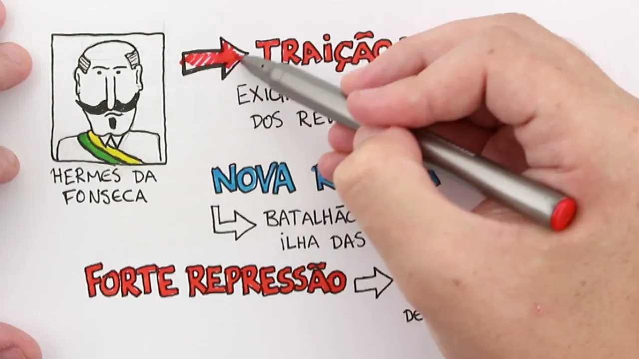 quem vai ser o protagonista dessa nova revolta não vai ser aqueles que tinham Realizado a revolta anterior não tinha nada a ver com o João Cândido com os outros marujos que tinham Realizado a revolta anterior mas o governo se utiliza desse pretexto dessa nova revolta que eram fuzileiros naval fuzileiros navais não eram nem marinheiros certo que tinham realizado essa revolta o governo Vai se aproveitar dessa nova revolta para eh ampliar o processo de repressão que já tinha acontecido com esse processo de traição aqui então uma forte repressão com prisões eh de todos os marinheiros envolvidos