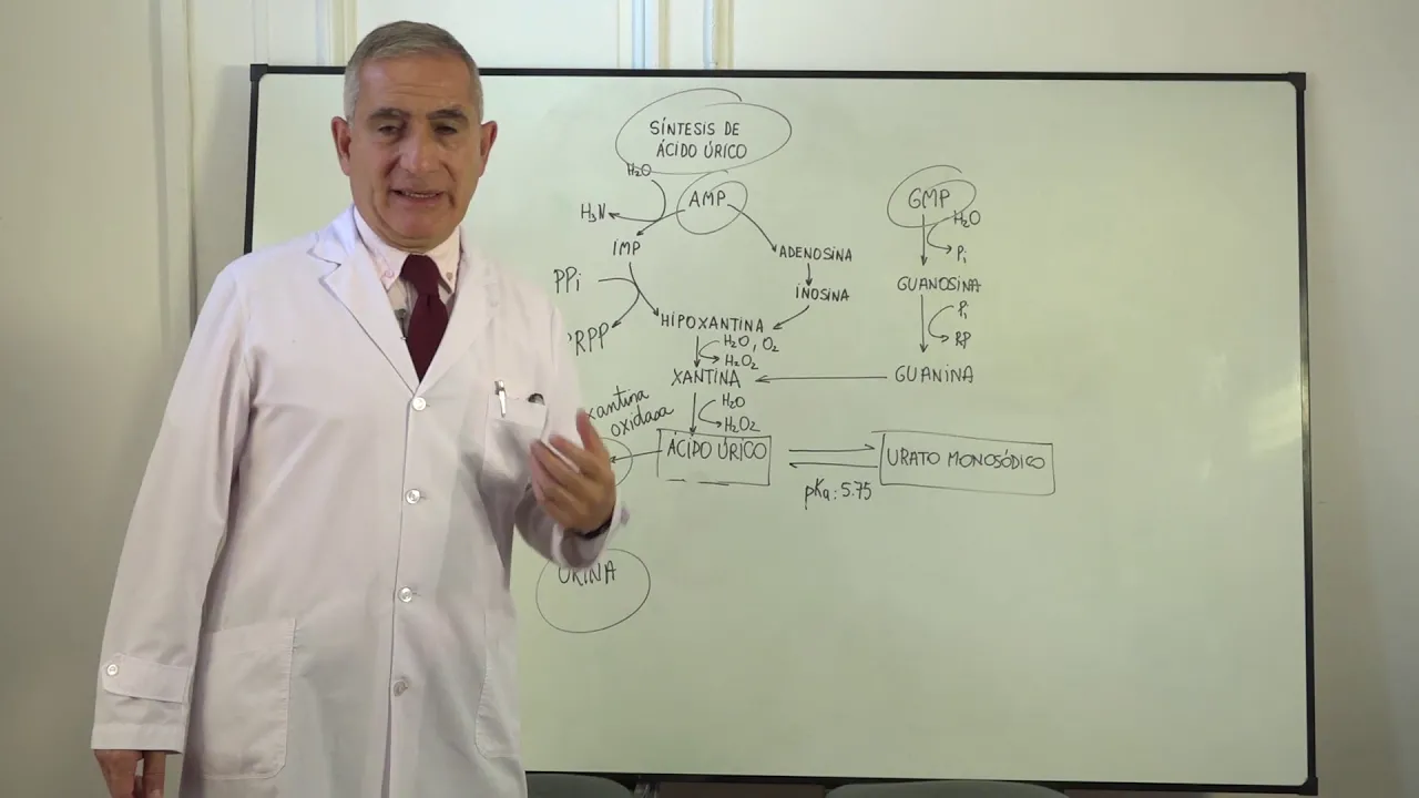 por otra parte el ácido úrico puede eliminarse a través de la orina y generalmente las cantidades de orina tienen que en el ácido úrico en la orina tiene que estar por debajo de los 750 miligramos por día para considerarse normales el ácido úrico tiene algunas particularidades que justifican muchas de su patología generalmente existen dos estados de presentación que son el ácido úrico y el grato monosódico el peca de este sistema es de punto 5.75 qué quiere decir esto que cuando el ph de un medio biológico esté por debajo de 5.75 predominará la forma de ácido