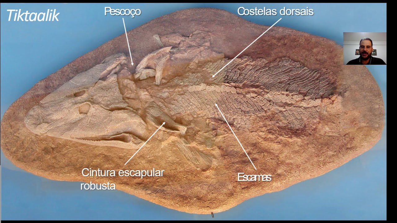 pé dando um tubarão branco para tentar dar uma ideia da escala do tá é desse peixe lá então existiam peixes em dimensões muito grandes que provavelmente se a provavelmente não com alguma certeza se alimentarão e se alimentavam de formas menores né em alguns paleontólogos Mas recentemente a criticaram né Essa hipótese com base em observações da do comportamento da fisiologia da anatomia de espécies viventes então esses outros paleontólogos né mais recentes eles viram que entre os peixes viventes os peixes só saem da água quando o ambiente no entorno dos corpos d'água é muito úmido né então