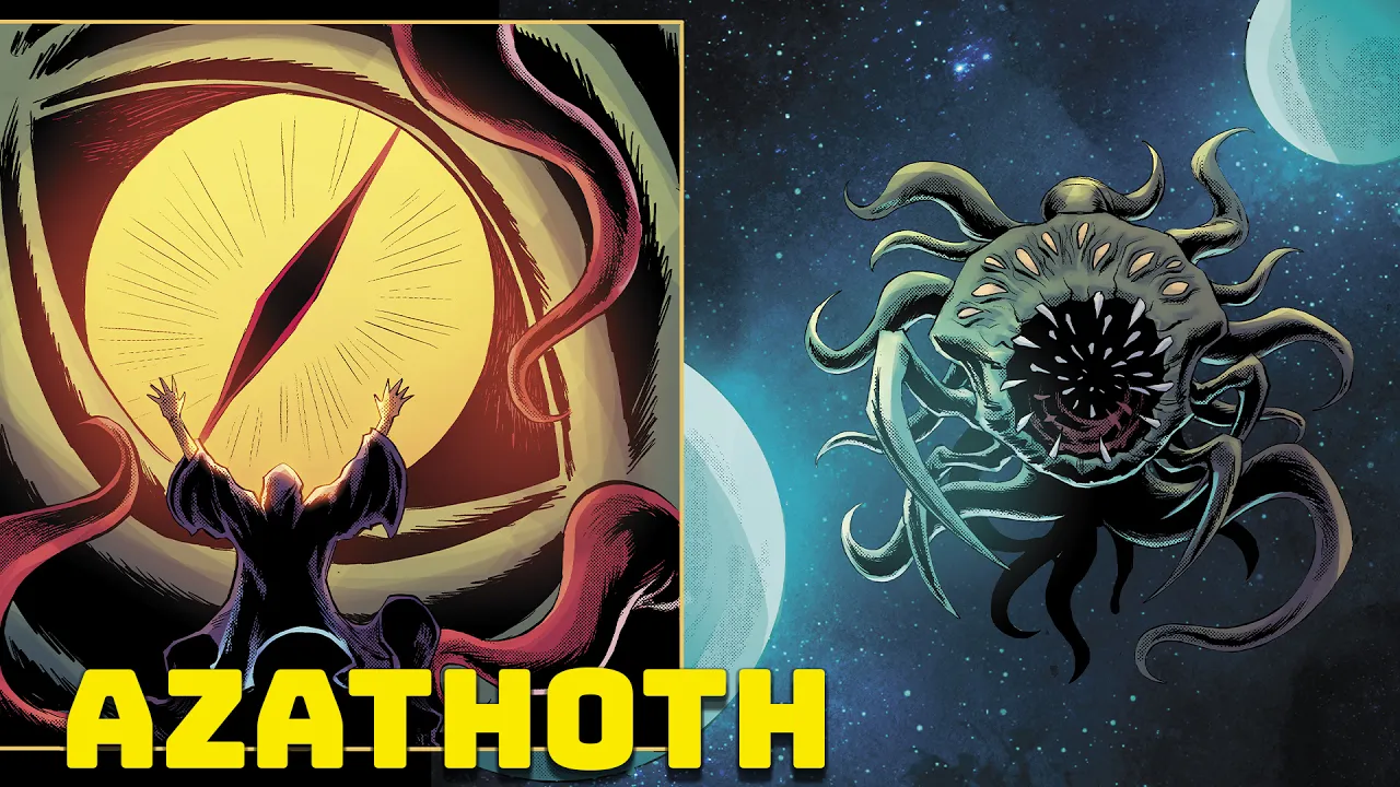 entrelaçam e se desfazem um domínio onde as leis da física são meras fantasias indescritível em sua essência azof é um ser cuja verdadeira forma escapa a compreensão humana um terror que transcende a definição a mente humana limitada e frágil não pode conceber tal presença sem se perder nas sombras da loucura azat encontra-se cercado por uma corte macabra de demônios que tocam flautas e Tambores em desarmonia este caos o mant como que em um profundo há quem diga que se a música parasse AZ despertaria e com ele aidade como a conhecemos se desintegrar Em Um Piscar