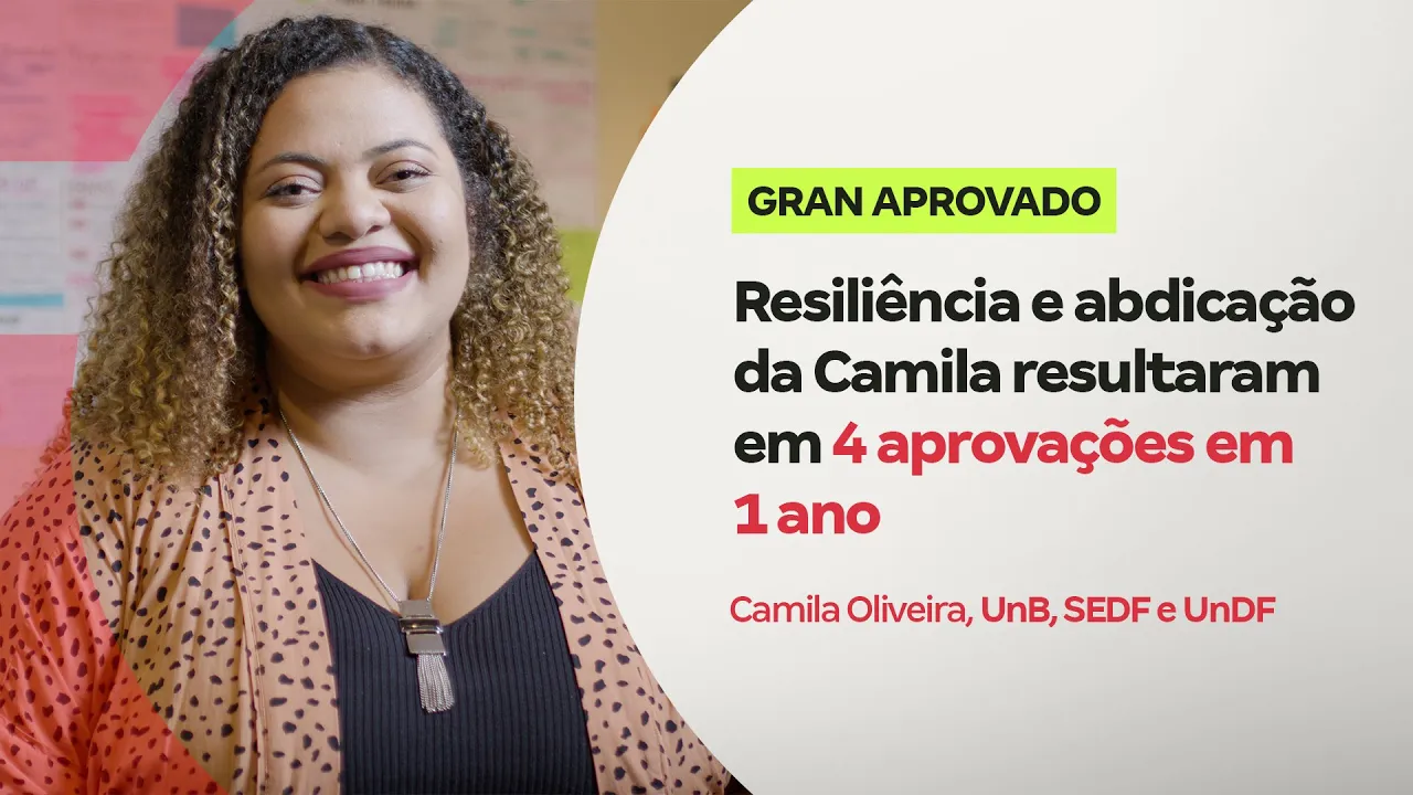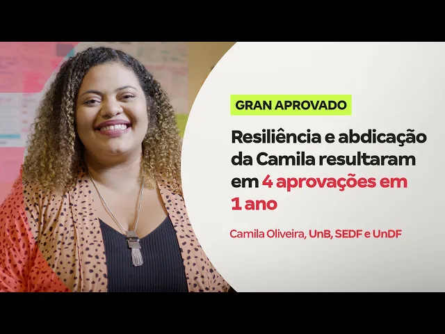 fiz pedagogia extremamente Cansativo e eu fui aprovada nessas duas provas logo depois eu fiz a dar um DF que também fui aprovada e foram quatro aprovações Eu costumo dizer que foi muito muito além do que eu pensei eu estudei quatro anos e eu consegui quatro aprovações uma para cada ano e eu falo que bom que isso chegou hoje eu estou na UnB ao mesmo tempo lá na UnB Eu pretendo fazer o meu mestrado doutorado continuar Investindo na minha formação porque Professor ou servidor nunca para de estudar eu sou Camila Oliveira aprovada em primeiro lugar na