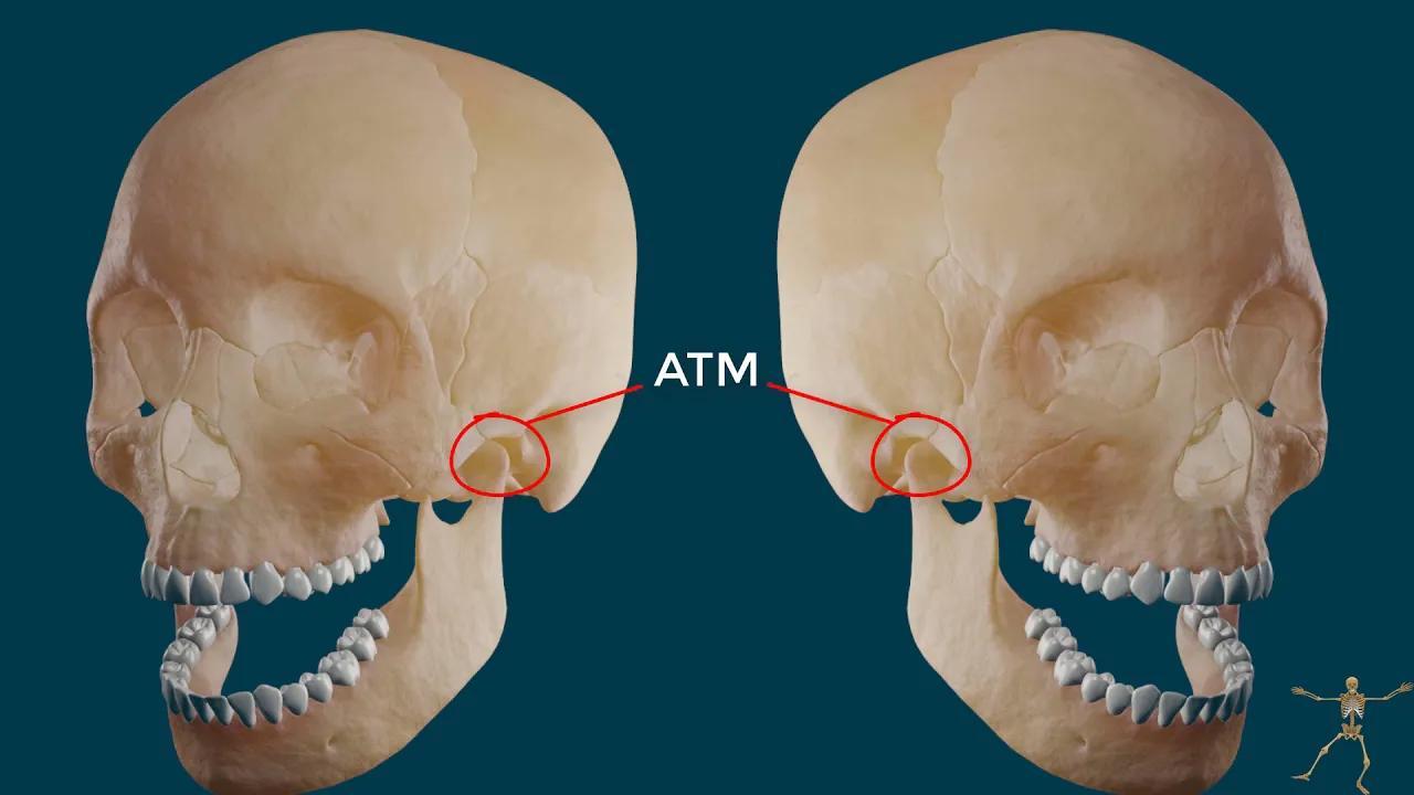 La articulación temporomandibular, en adelante la vamos a llamar ATM, son 2 una a cada lado del cráneo y tienen una importancia vital ya que sin ellas no podríamos comer. Permiten los movimientos de la mandíbula. Los componentes óseos de esta articulación son: las ramas mandibulares abajo y los huesos temporales, arriba.