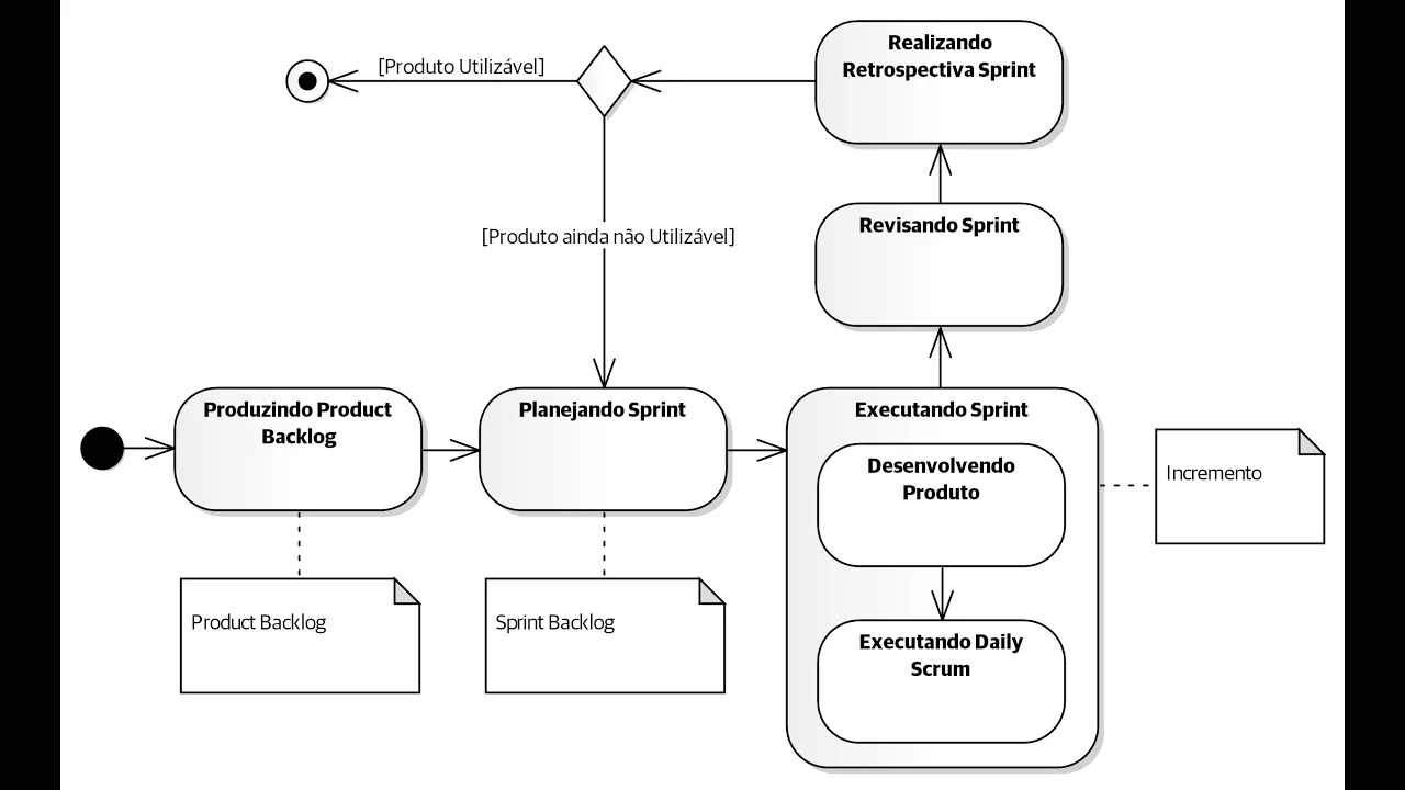 scrum depois se passa para a execução do Sprint priamente dito que Poderá durar várias semanas até um mês Onde o produto será desenvolvido diariamente vai ser executado uma uma reunião diária uma a o scr diário onde os membros da equipe dirão o que fizeram No dia anterior o que pretendem fazer no dia atual e quais são as dificuldades que eles estão tendo E essas dificuldades elas devem ser sanadas pelo scrummaster Ah o resultado do Sprint é o incremento que é um conjunto de funcionalidades utilizáveis pelo cliente que deverão ser adicionadas ao produto isso não significa