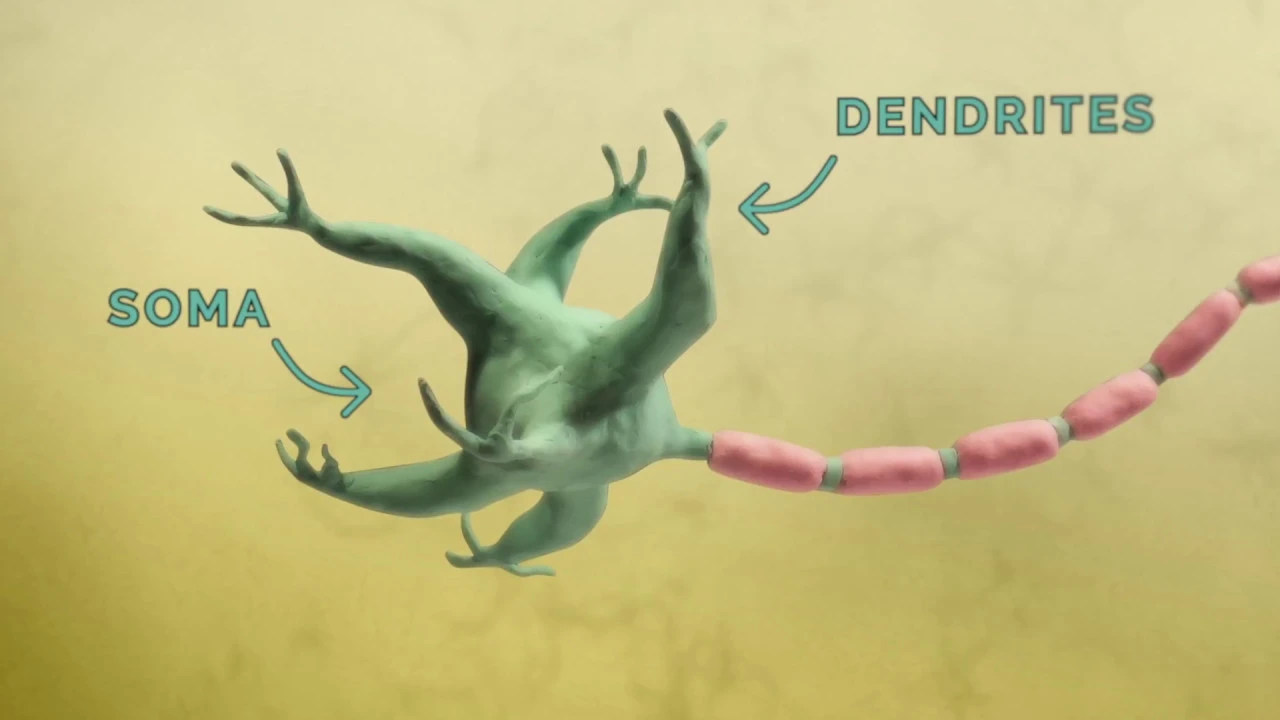 A signal received by a dendrite is passed to the cell body. If there is a sufficient depolarization of the cell body membrane to initiate an action potential, then an action potential is sent down the axon. The axon then carries the propagating action potential to another neuron.