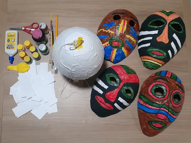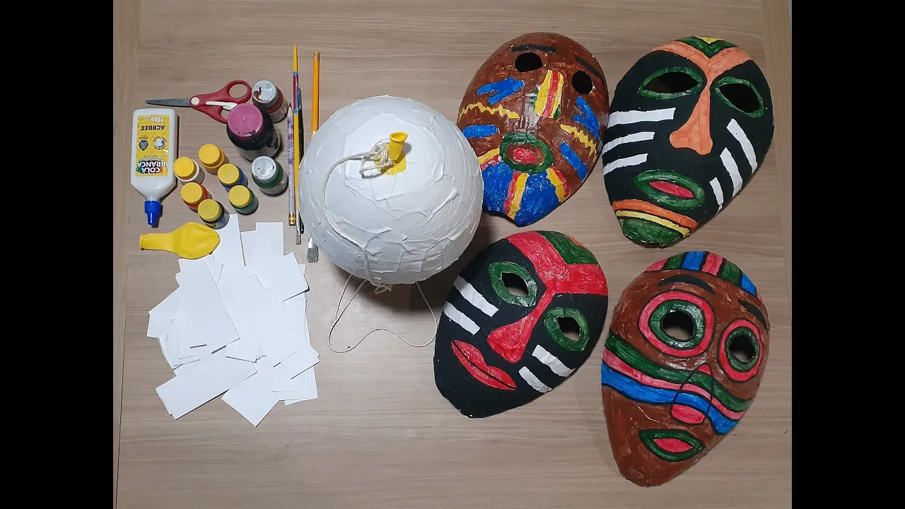 E aí [Música] [Música] o Olá Sou professora Morgana trabalha não sei Regina Maria da Luz proposta de vivência a produção de máscara com características da arte africana e E aí e para fazer a máscara vamos precisar de tirinhas de papel cola balão e um pincel para passar a cola vamos utilizar a técnica da papietagem vamos precisar de um lápis de escrever tintas para fazer a pintura Pincéis e um pedacinho de barbante o iniciando a vivência você deve encher o balão que fica aproximadamente do tamanho do seu rosto e vamos começar colando tirinhas de papel no