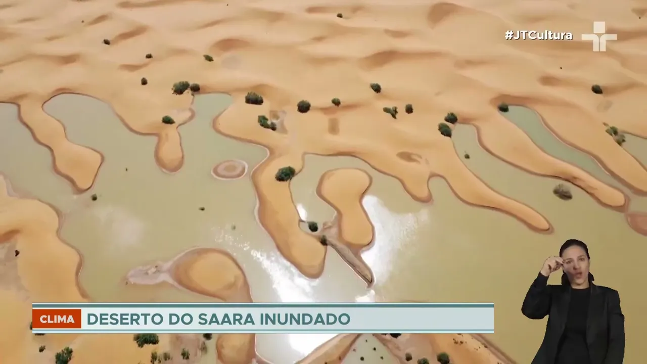 pela primeira vez em 50 anos o deserto do Saara no Marrocos ficou inundado as imagens são de satélites da Nasa a Agência Espacial norte-americana Foram dois dias de chuvas intensas que formaram lagos e rios que nunca tinham sido vistos por pelo menos uma geração choveu quatro vezes mais que o esperado para um mês inteiro o Saara se estende por 12 países do Norte Centro e Oeste do continente africano é o deserto mais quente do mundo e pelo menos nos próximos meses haverá mudanças nas temperaturas na região a população local principalmente os agricultores que sofriam com