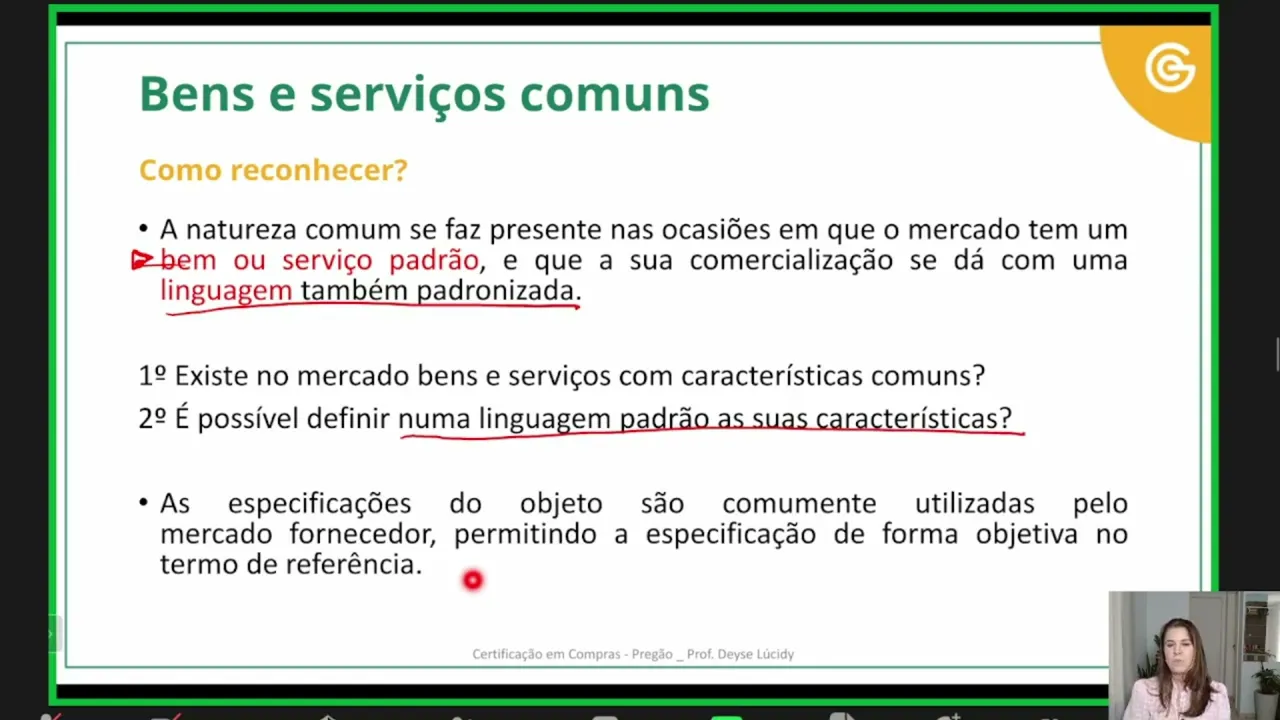 hum Deu para entender não vamos lá vamos adiante para poder ficar mais claro para vocês como que eu vou reconhecer se é um bem ou serviço comum primeiraa coisa essa natureza comum ela tá presente quando eu tenho um bem ou serviço padrão então primeiro ponto vê se é bem ou serviço padrão é padrão não é se não for padrão já não é comum e outra coisa a sua comercialização tem que se dar de uma forma com uma linguagem também padronizada ou seja aquelas expressões a forma de descrever o bem ou o serviço padronizada no mercado