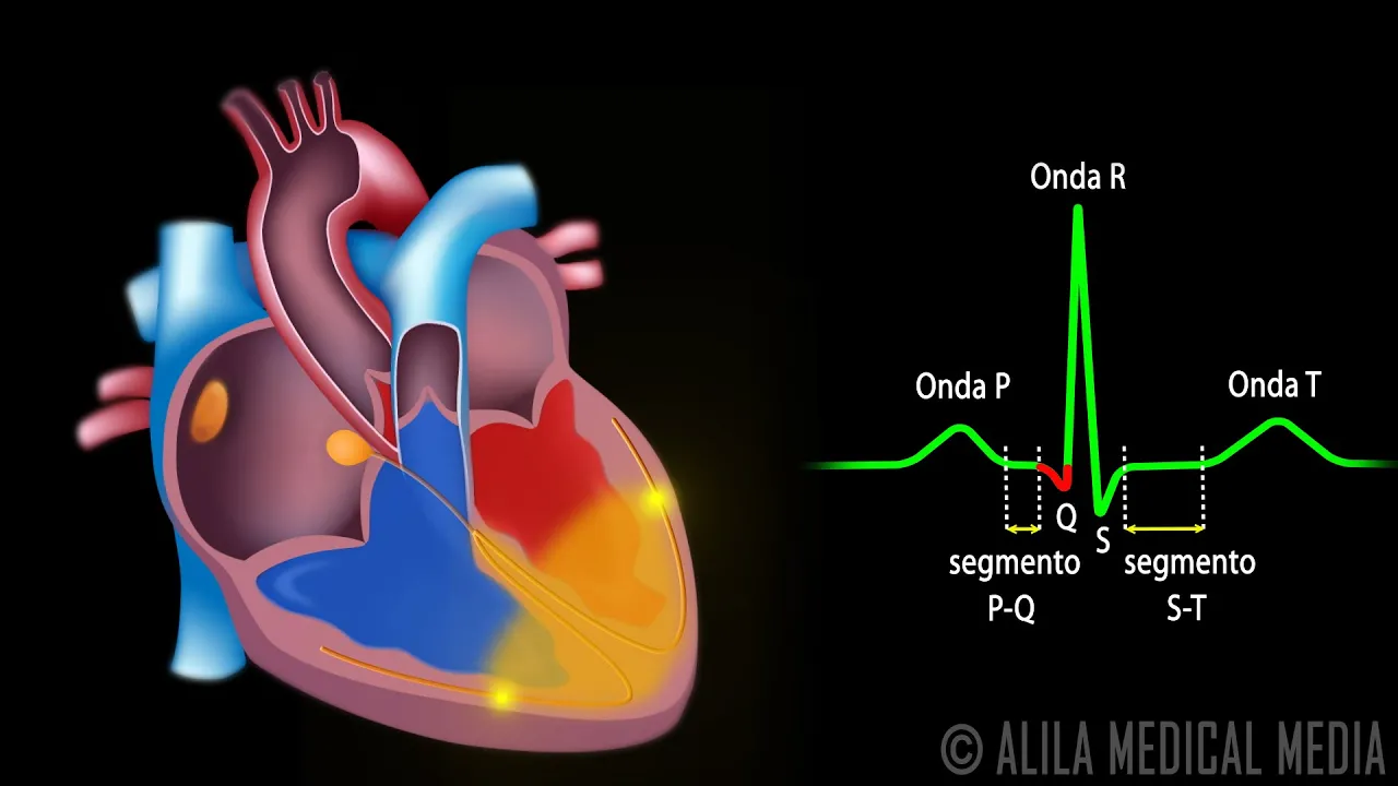 Um ECG é um registo composto de todos os potenciais de ação produzidos pelos nódulos e células do miocárdio. Cada onda ou segmento do ECG corresponde a um certo evento do ciclo elétrico cardíaco. Quando os átrios estão cheios de sangue, o nódulo SA dispara, sinais elétricos propagam-se através dos átrios e levam-nos a despolarizarem.