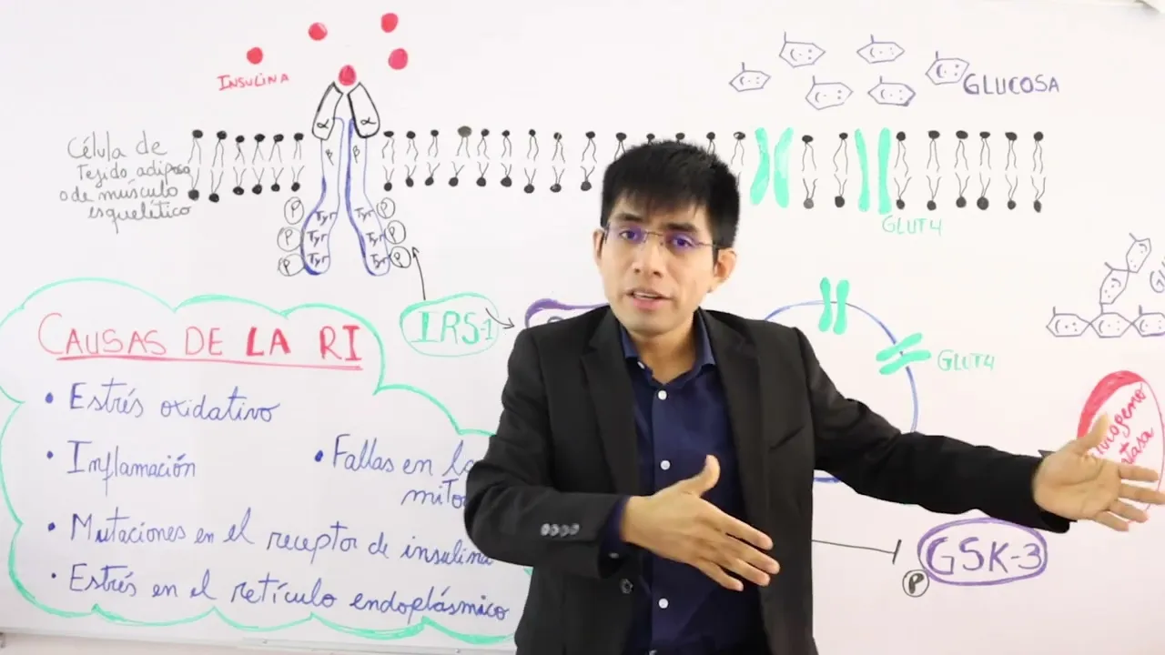 receptor no interpreta apropiadamente la señal pero no solamente el receptor sino también todos estos actores estos actores están jugando un papel muy importante genéticamente pueden haber fallas en el receptor como tal y en estos componentes que afectan la manera como las células particularmente las células de tejido adiposo y músculo esquelético cómo estas células interpretan la señalización interpretan a la insulina Entonces si no si están fallando estos componentes la insulina no va a tener un efecto apropiado Cuáles son las causas de esta resistencia a la insulina qué es lo que puede causar que toda esta señalización