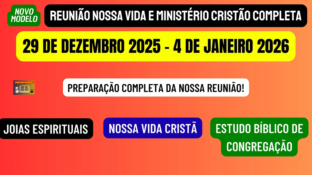 Sejam todos muito bem-vindos ao nosso canal Ajuda para as reuniões. Esperamos que Jeová esteja com cada um de vocês, queridos irmãos e queridas irmãs. E nesse vídeo vamos estar disponibilizando a reunião Nossa Vida e Ministério Cristão completa desta semana, 29 de dezembro de 2025 a 4 de janeiro de 2026.