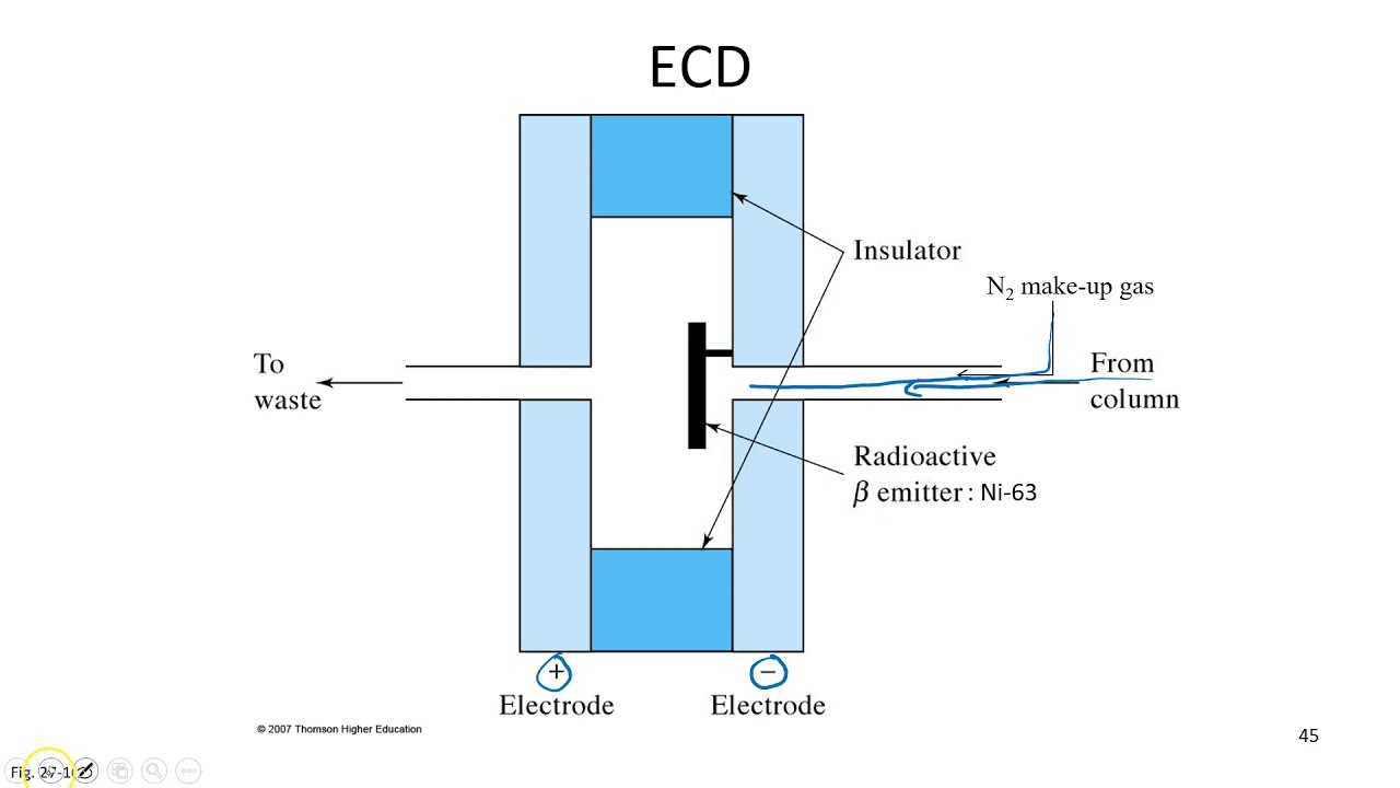 compounds in a flame which generated by hydrogen and air to detect these ions two electrodes are used to provide a potential difference the positive electrode doubles as the nozzle head where the flame is produced the other negative electrode is positioned above the flame when an organic compound is mixed within the hydrogen flame mainly carbon ions are generated and a current is produced between the electrodes proportionally to the amount of organic compound present this current is measured with a volectro meter amplified into proper voltage and fed into an integrator the manner in which the final data