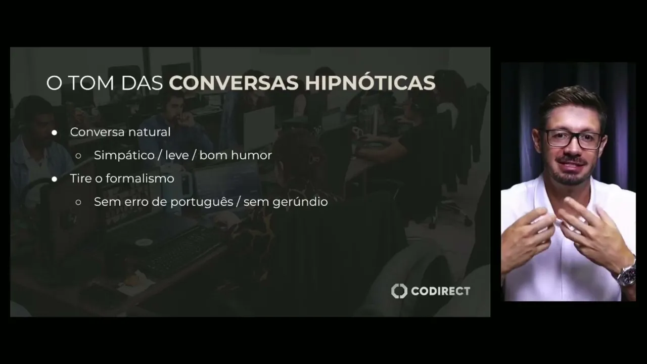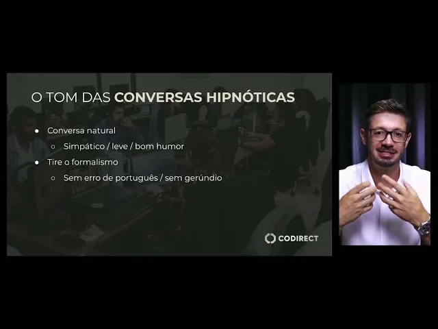 Técnica das conversas hipnóticas vai te ajudar a converter os leads em clientes O que são as conversas hipnóticas tá ela é uma conversa comercial inteligente observa que ela é uma conversa com foco comercial de forma inteligente não é copiar e colar um texto no WhatsApp explicando como funciona o seu serviço ele tem que ser uma conversa que vai conduzir o cliente até o fechamento e é nosso papel saber como conduzir o nosso eu tô falando seu ou da suu secretário ou do seu vendedor que está interagindo com os leads através do WhatsApp ou através de