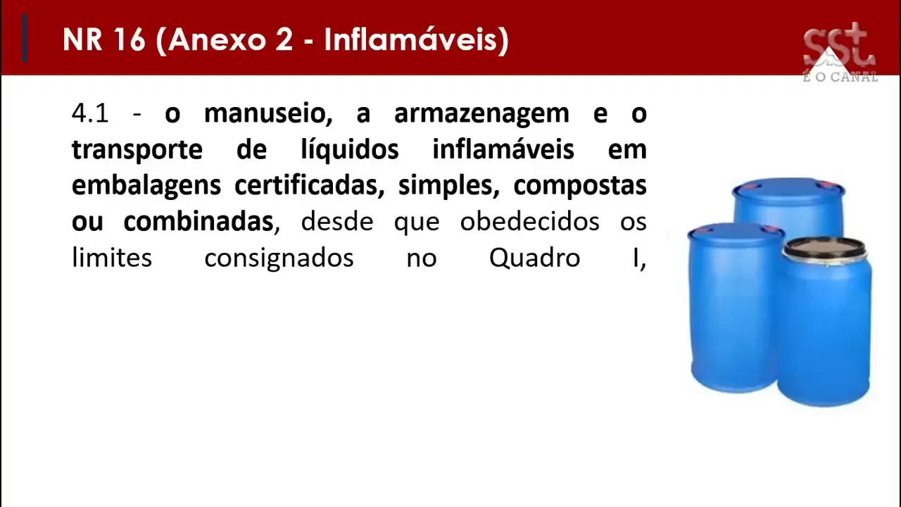 total de recipiente mãos e armazenados manuseados ou transportados sempre que obedecidas as linhas pedidas pelo seu trabalho e emprego ea legislação sobre produtos perigosos relativa aos meios de transporte utilizados então eu tenho um galão de 5 litros ok lacrado da fábrica do direitinho mas eu tenho 100 galões de 5 litros tem muito muito combustível muito inflamado não interessa ele tá dizendo independente número total de recipientes armazenados e ou manuseados ou transportados estão nessa situação também não gera direito a adicional o quadro que ele falou lá em cima é esse aqui ó então ele vai dar
