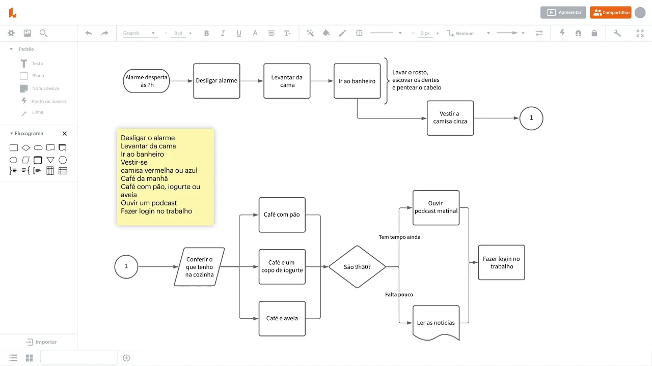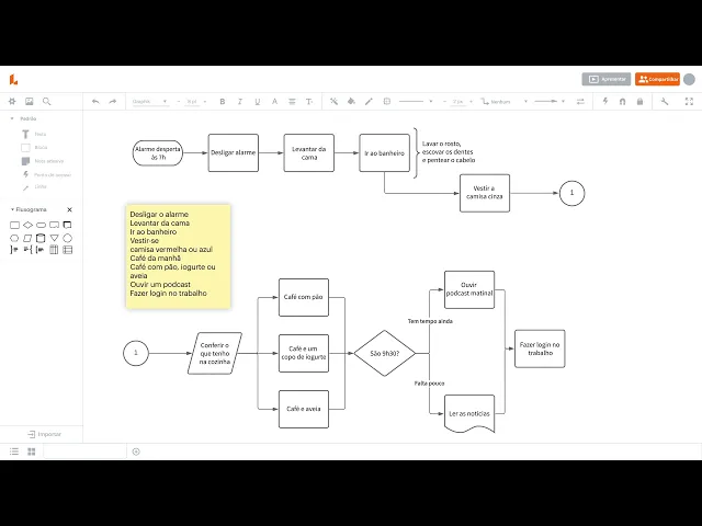 deve primeiro considerar o propósito e o escopo do que você deseja comunicar Talvez seja algo complexo como mostrar as relações entre as páginas de um site hoje vamos criar um fluxograma simples para entender melhor e aprimorar minha rotina matinal e depois preciso identificar minhas tarefas em ordem cronológica todos os dias acorda e desliga o meu despertador às 7:00 me levanto da cama e vou ao banheiro depois me visto escolha uma camisa vermelha o azul antes de ir tomar o café da manhã e no café da manhã tenho três opções diferentes café com pão café com