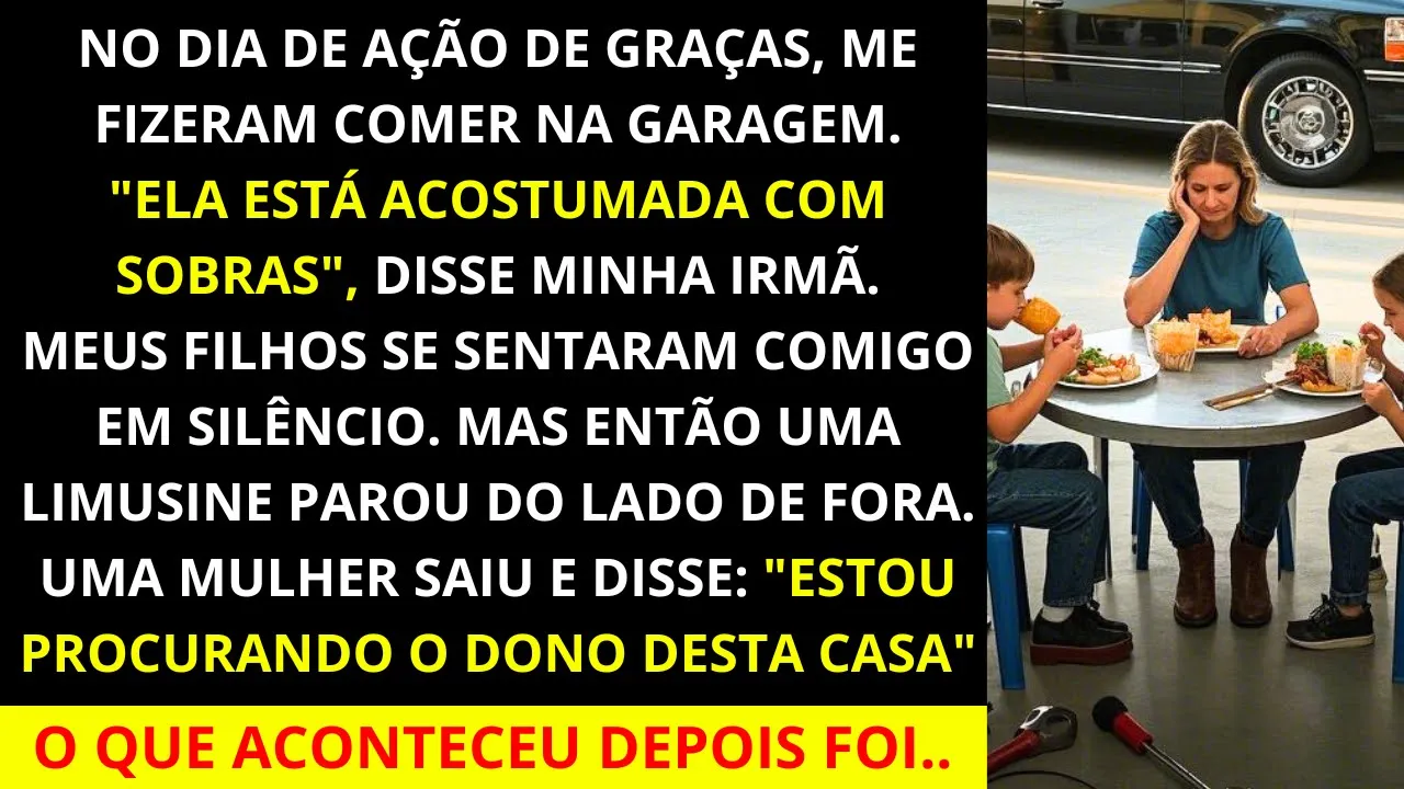 o dia de ação de graças já estava frio mas nada me preparou para o frio que senti quando minha irmã apontou para a garagem e disse que eu estava acostumada com sobras ela não sussurrou não titubeiou ela simplesmente me entregou um prato daqueles de papel virou as costas e entrou em sua sala de jantar perfeita onde o resto da família já estava sentado sob luzes douradas e lustres polidos fiquei lá por um segundo segurando aquele prato frágil meus filhos atrás de mim lucas e Sofia de 12 e anos nenhum deles disse uma palavra eles apenas olharam para mim esperando o que viria a seguir eu não conseguia chorar não na frente deles não depois de tudo o que já passamos então sorri os levei pela porta lateral e para dentro da garagem cheirava a gasolina e poeira uma única mesa dobrável estava encostada na parede com duas cadeiras de metal e uma caixa de papelão para sentar sem decorações sem calor apenas silêncio e o som de garfos raspando plástico foi lá que comemos nosso jantar de ação de graças meus filhos não reclamaram eles se sentaram com as costas retas os olhos fixos na comida sofia cutucou seu doce de torta de batata com o garfo lucas cerrou o maxilar como faz quando tenta não chorar e foi nesse momento que senti algo mudar eu não estava brava nem magoada só olhei para eles e soube que ali eu tinha parado de implorar para pertencer e então algo inesperado aconteceu uma limusine preta apareceu do lado de fora da casa não carro comum era uma limousine todos lá dentro pararam vi suas silhuetas através das cortinas da janela curiosos confusos aglomerando-se em direção à frente da casa mas o carro não parou na porta da frente o motorista circulou para a garagem a entrada o motor desligou e uma mulher saiu alta e elegante vestindo um casaco azul marinho que parecia caro mesmo de longe ela olhou ao redor e perguntou: "Estou procurando o dono desta casa. " Quando me levantei seus rostos caíram bom deixa eu voltar um pouco e te contar tudo exatamente como aconteceu eu não tinha planejado ir para a casa da minha irmã no dia de ação de graças eu disse a mim mesma que o ano passado seria a última vez mas então as crianças começaram a perguntar: "A tia Renata estará lá? " A vovó vai se lembrar do meu nome desta vez e antes que eu percebesse eu estava passando um vestido de segunda mão e assando o pão de milho na nossa pequena cozinha tentando agir como se tudo fosse perfeitamente normal moramos em um modesto apartamento de dois quartos nos limites da cidade não é essas coisas toda mas é limpo quente e cheio de amor trabalho em longos turnos como recepcionista em uma clínica pediátrica e pego trabalhos freelance de escrita paralelamente não sobra muito tempo ou dinheiro para extras mas meus filhos não reclamam eles nunca reclamam lucas tem 12 anos agora já é mais alto que eu cheio de uma força silenciosa e olhos pensativos sofia tem nove e ainda acredita que o mundo é bom no entanto eu posso ver essa crença oscilar um pouco mais a cada ano na manhã de ação de graças fiquei em frente ao espelho tentando decidir se minhas botas velhas pareciam apresentáveis o suficiente eu disse a mim mesma que não era para impressionar ninguém eu estava fazendo isso pelos meus filhos mas a verdade é que parte de mim ainda queria ser vista minha irmã Renata mora em um condomínio fechado onde até as latas de lixo parecem caras sua casa é enorme e fria do tipo que cheira a esmalte de limão e coisas que você não deve tocar ela se casou bem como minha mãe gosta de dizer andré um advogado presunçoso e educado sempre com um Bluetooth no ouvido e algo condescendente para falar sobre escolas públicas eles têm três filhos babás um Handver uma governanta que não fala muito português renata e eu não somos próximas desde que éramos adolescentes ela sempre foi a que tinha notas perfeitas cabelo perfeito tudo perfeito eu era artística aquela que rabiscava em cadernos e tinha potencial mas nunca conseguiu quando entrei na garagem dela a festa já estava a todo vapor eu podia ouvir risadas no quintal e o barulho de pratos pelas janelas abertas respirei fundo e me virei para as crianças vocês dois estão prontos sofia assentiu segurando a torta de batata doce que ela me ajudou a fazer lucas apenas disse: "Vamos acabar logo com isso" bati uma vez e entrei ninguém atendeu a porta eles nunca atendem era sempre a mesma coisa eu entrando como uma convidada na festa da minha própria família minha mãe Marta mal levantou os olhos de sua taça de chardonê ela estava sentada na beirada do sofá observando os filhos de Renata dançarem "oi mãe" eu disse colocando a torta no balcão ela piscou para mim sorriu vagamente e voltou sua atenção para suas netas ó você parece cansada ela disse daquele jeito que ela faz como se fosse preocupação mas na verdade é julgamento em um vestido de veludo Renata apareceu da cozinha com saltos altos demais para alguém fazendo purê de batatas oh você trouxe algo ela disse olhando para a torta que fofa andré passou segurando um copo de algo e Grazi ele disse usando o apelido eu odeio as crianças parecem grandes não nos foi oferecido assentos não nos ofereceram bebidas não havia serviço nenhum gesto de boas-vindas nenhum calor meus primos estavam todos lá conversando servindo vinho passando aperitivos de uma mão bem cuidada para outra e então lá estava eu em pé em um canto com meus dois filhos sorrindo através do constrangimento como eu sempre faço sofia sussurrou posso dar minha torta para a vovó eu assenti ela se aproximou e estendeu para minha mãe como se estivesse entregando a ela um tesouro minha mãe pegou olhou para ela por meio segundo e disse: "Ó batata doce que pitoresco" foi quando percebi que tinha cometido um erro mas era tarde demais para sair o jantar estava sendo servido e pensei que talvez pelo menos conseguíssemos um lugar à mesa por apenas uma hora disse a mim mesma que co