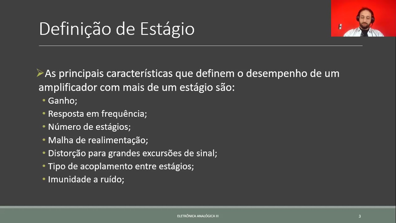 estágios não integrantes onde a impedância de entrada é muito alta ela tende a infinito a a gente consegue obter um ganho total que é a multiplicação de um vezes a 2 vezes a três vezes Quantos estágios e verem que dessa maneira então a gente finaliza com essa fórmula aqui ó o ganho total do circuito vai ser o que há um vezes a 2 vezes a três vezes a quatro cinco seis quanto se estiver tá isso para ganho linear e aqui para o ganho em DB da mesma maneira só que o cálculo ele é feito utilizando