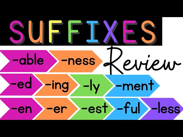 [Music] let's review suffixes a suffix is a letter or group of letters added to the end of a word to form a different word it's important to know suffixes because they change the meaning of words let's jump in and review suffixes e d spells Ed D or t it makes three different sounds when Ed is added to a word it makes the verb past tense or it means it happened already walked smelled painted iing in when we add in to a word it means that it's happening now it's in the present flying driving read e