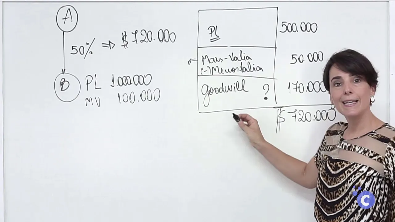 ter variações em vários itens no ativo e do passivo vamos trabalhar aqui com essa variação de 100 mil em um terreno terreno está registrado por 200 e vale 300 então existe uma mais valia de 100 mil é a mais-valia total vou colocar aqui mais valia de 100 mil só que como estou adquirindo 50% deste negócio a minha parcela de pagamento pela mais valia é de metade nesse 100 mil 50 mil isso aqui completou 550 mil só que eu estou pagando os 720 esta diferença que eu estou pagando dos 550 para o 7 120 ou seja