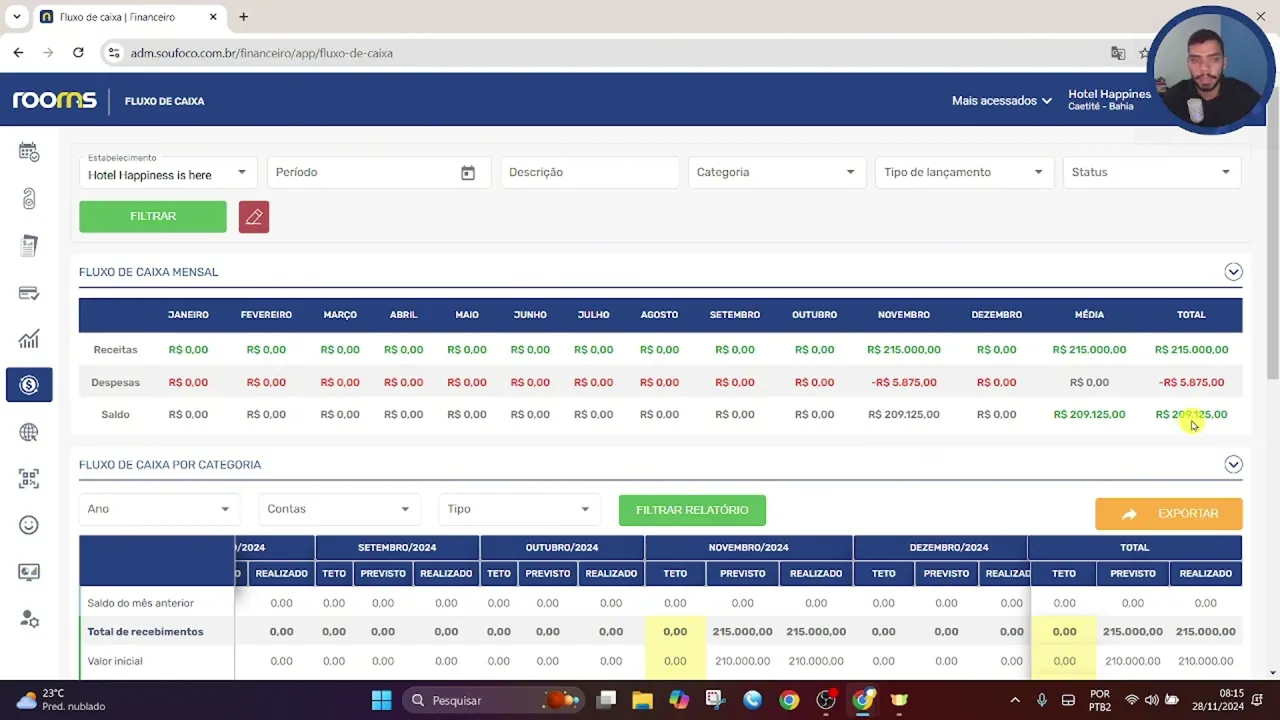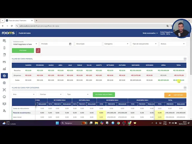 esse fluxo então aqui eu consigo buscar pelo período pela descrição dos lançamentos a categoria o tipo de lançamento E também o status é só clicar em filtrar que conseguimos fazer uma busca mais detalhada no fluxo de caixa mensal a estrutura é bem simples conseguimos consultar os valores de receitas Ger no mês também de despesa e o saldo após essas movimentações também conseguimos verificar a média desse ano e também o total e desse ano dos meses aqui do do ano verificado Vale ressaltar também que para para que a consulta de meses um mês não impacta no