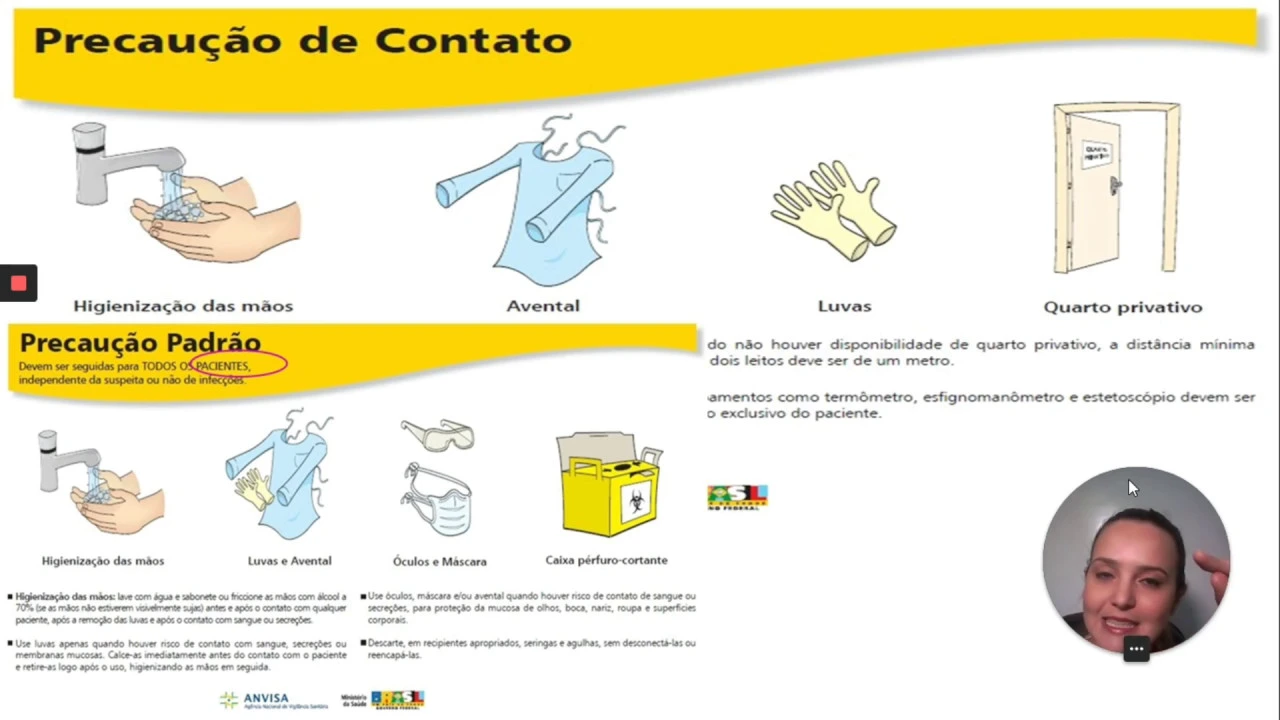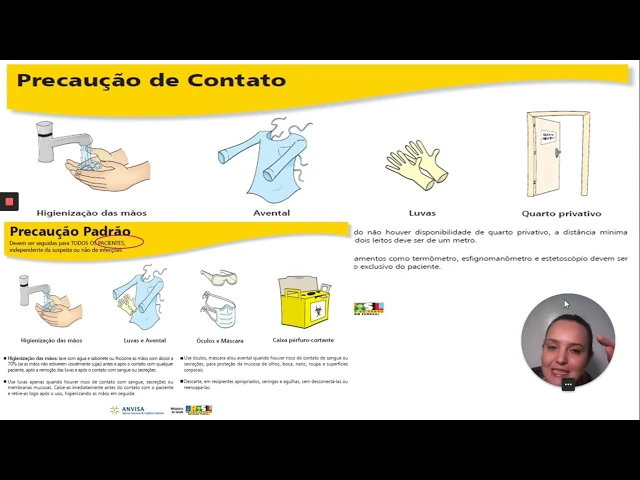 ele transmitida através de contato né então é o remo e adquiro guardem isso eu preciso estar calçada de luva até para mexer equipo para mexer lá no monitor multiparamétrico ok então uso da luva é obrigatório precaução de contato na verdade uso da é obrigatório sempre né mas existe na nossa aula anterior mas guardem isso gente a luva aqui ela é obrigatória porque você precisa vai o monitor para o armando é preciso desligar o motor assim que calçar a luva tá para poder apertar no meu monitor zinho porque senão eu posso adquirir o microrganismo fala que