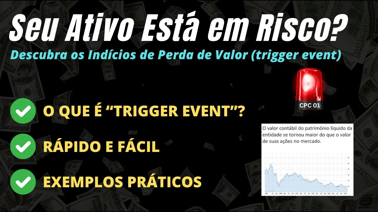 nesse vídeo iremos falar como o CPC 01 Define um Trigger event ou indício de perda de recuperabilidade de um ativo essa perda de recuperabilidade também é conhecida como impairment a tradução de trigger é gatilho para o português esse gatilho deve ser disparado sempre que houver um evento que indique que os ativos perderam significativamente a sua representatividade Econômica segue alguns exemplos de indícios tratados no CPC 01 verifique se o valor de mercado do ativo diminuiu sensivelmente por exemplo um imóvel perto de uma área de desabamento verifique se houve mudança significativas no ambiente em que opera a