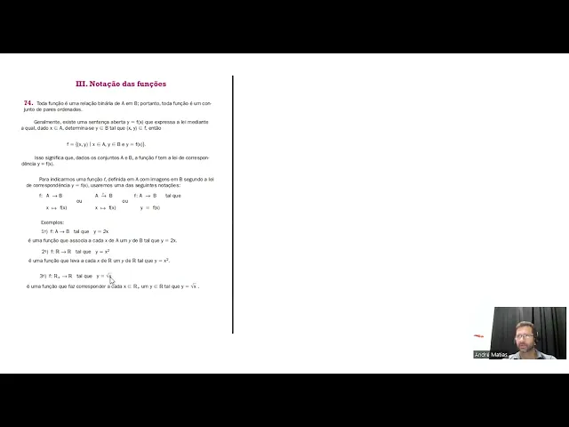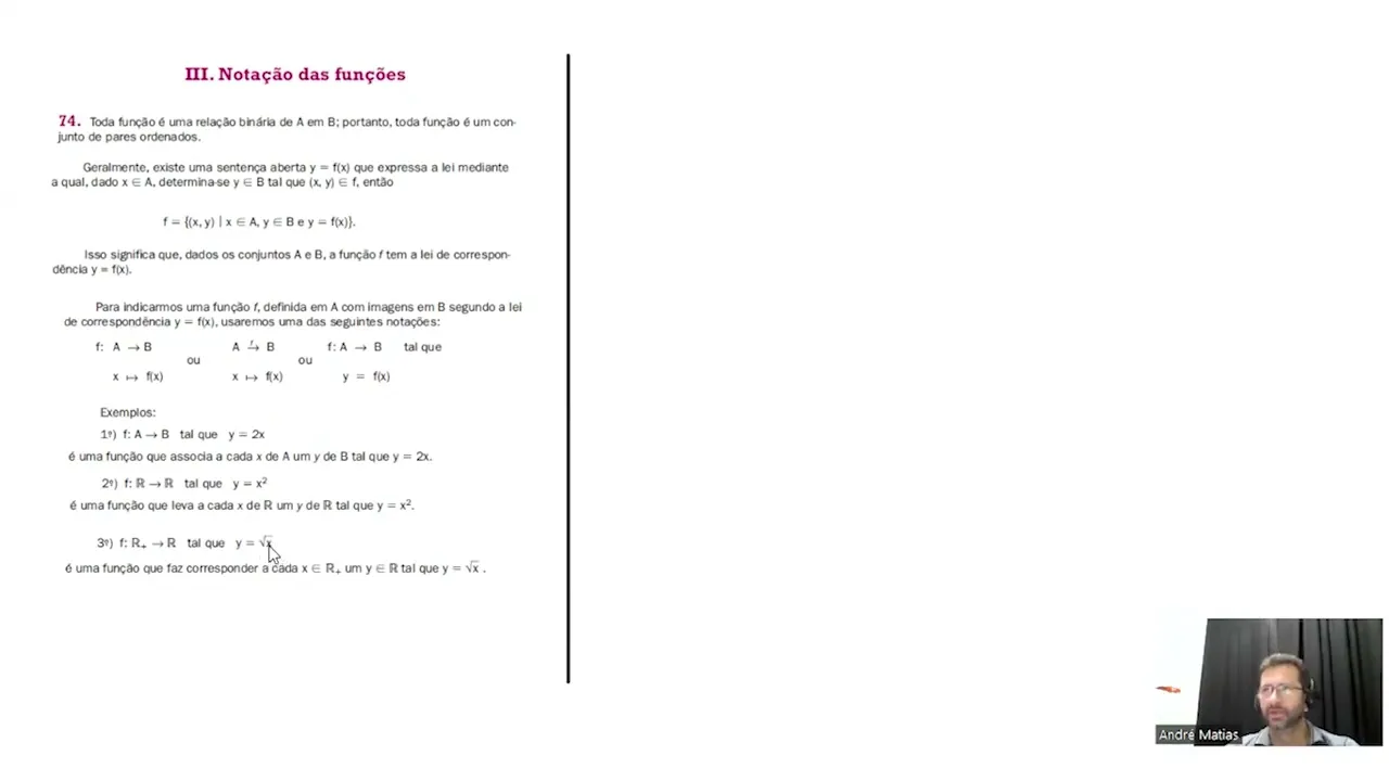 [Música] Olá pessoal nesse vídeo vamos continuar sobre funções e vamos falar agora sobre notação de funções toda função é uma relação binária de a em B portanto toda função é um conjunto de pares ordenados quando você pega um elemento do conjunto A né aplica a função a lei de formação da função f e encontra o elemento do conjunto B esse ponto a esse elemento do ponto a junto com o elemento do ponto b chamamos de parordenado geralmente existe uma sentença aberta Y = FX que expressa a lei mediante a qual dado x pertencente ao conjunto