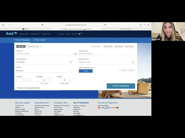 Oi eu sou a ivanise e essa é a parte dois da aula básica para quem não sabe procurar passagens com milhas e eu vou mostrar o site de cada companhia que eu falei na aula anterior para quem não mexe para quem não não tem o hábito de entrar no sites não sabe não sabe muito então vou esclarecer todas as dúvidas vou começar aqui com a azul azul tem tanto site quanto aplicativo o aplicativo é da azul e o site é voeazul. com. br eh aqui tem passagens aéreas hotéis ingressos cruzeiros e etc vamos lá a origem que eu escolhi foi Manaus para ilustração aqui né para Fort laurer de código IATA fll tanto Miami quanto Fort laurer de mesmo Miami porque é próximo mas a gente vai escolher forte Laura herde a data eu vou colocar mais paraa frente an não tá até aqui 9/11 a 22/11 perfeito exibir valores em Reais ou em pontos em pontos e em relação a passageiros a gente tem que olhar aqui adulto criança bebê bebê de 0 a 23 meses não paga tá então se for mais de um passageiro você seleciona aqui no meu caso eu vou exemplificar apenas com o mesmo confirmar Vamos fazer as buscas e esperar confirmar em Pontos devolver com pontos já saiu aqui olha Manaus para aedio no dia 9/11 51.