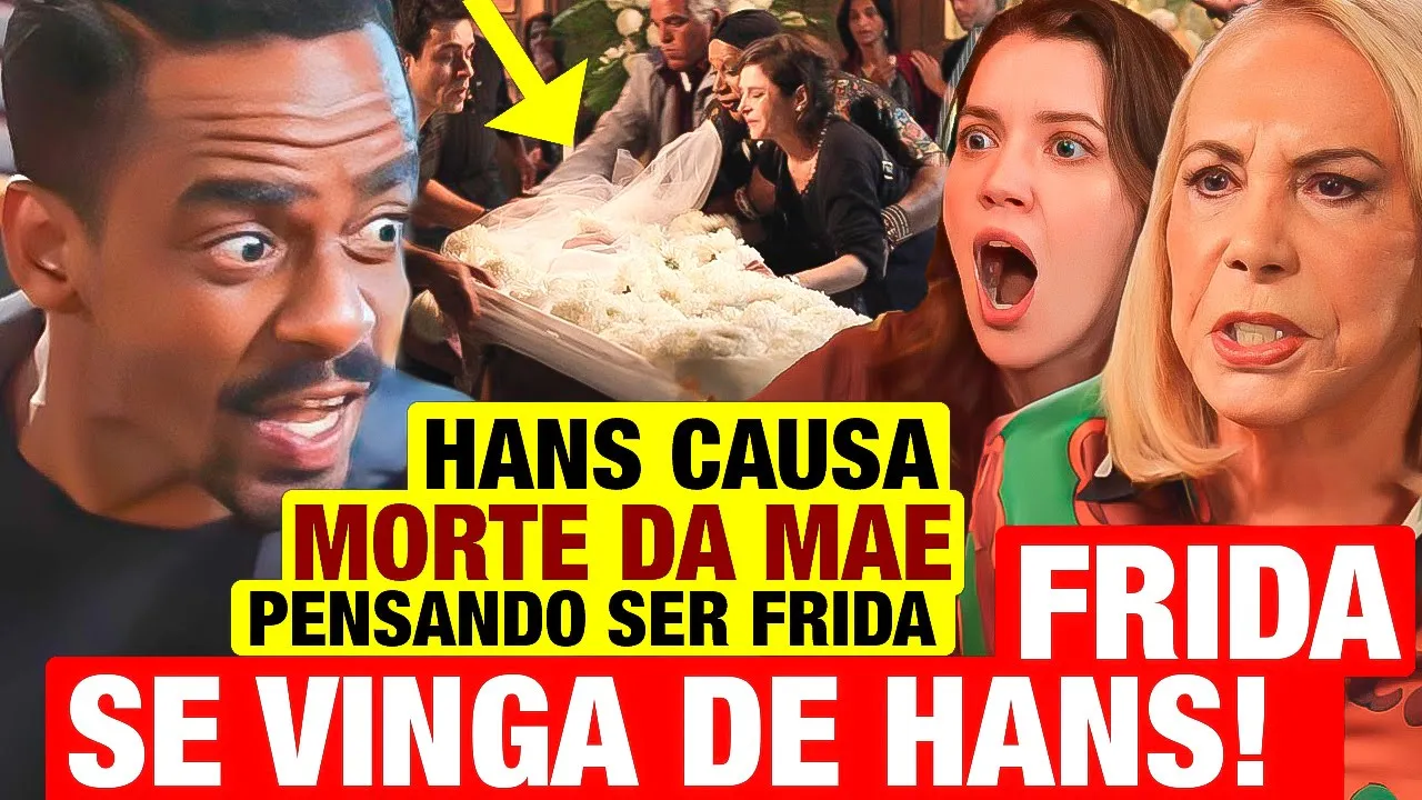 Começou a sair para o samba Electra diz Pois é até estava saindo com o Furtado né Tadinho Júpiter fala temos que ir no velório consolar o Hans Andrômeda questiona o Hans Aposto que ele nem deve estar triste ele não tem sentimento nenhum enquanto isso Hans chega eufórico em casa e acaba levando o maior susto ao ver Frida na sala nervoso ele pergunta Mãe o que você está fazendo aqui a notícia que você quer dizer que a titia se foi já tá rodando a cidade ninguém pode te ver Frida se aproxima e responde eu quero saber