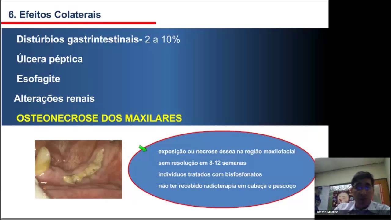 Dessa maneira, compromete um pouco mais ainda o processo de cicatrização de mucosas. Então, o efeito que inicialmente acreditava-se que era só sobre o tecido ósseo, hoje sabe-se que não é só sobre o tecido ósseo, ele tem um efeito genérico, muitas vezes comprometendo o processo de cicatrização, de reparo. Não só de tecido ósseo, mas também de tecidos moles nos pacientes.