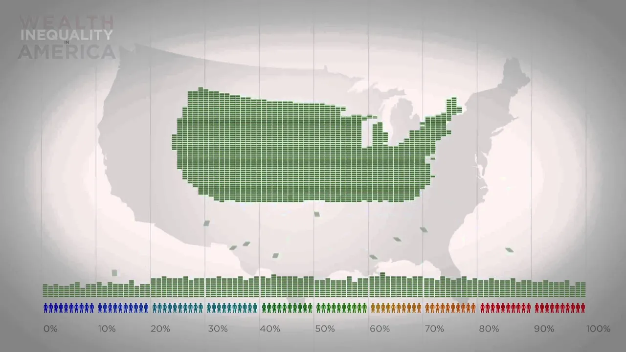 bankers a CEO maybe a celebrity or two now let's line them up according to their wealth poorest people on the Left wealthiest on the right just a steady row of folks based on their net worth will colour-code them like we did before based on which percent quintile they fall into now let's reduce the total wealth of the United States which was roughly fifty four trillion dollars in 2009 to this symbolic pile of cash and let's distribute it among our 100 Americans well here's socialism all the wealth of the country distributed equally we all know that